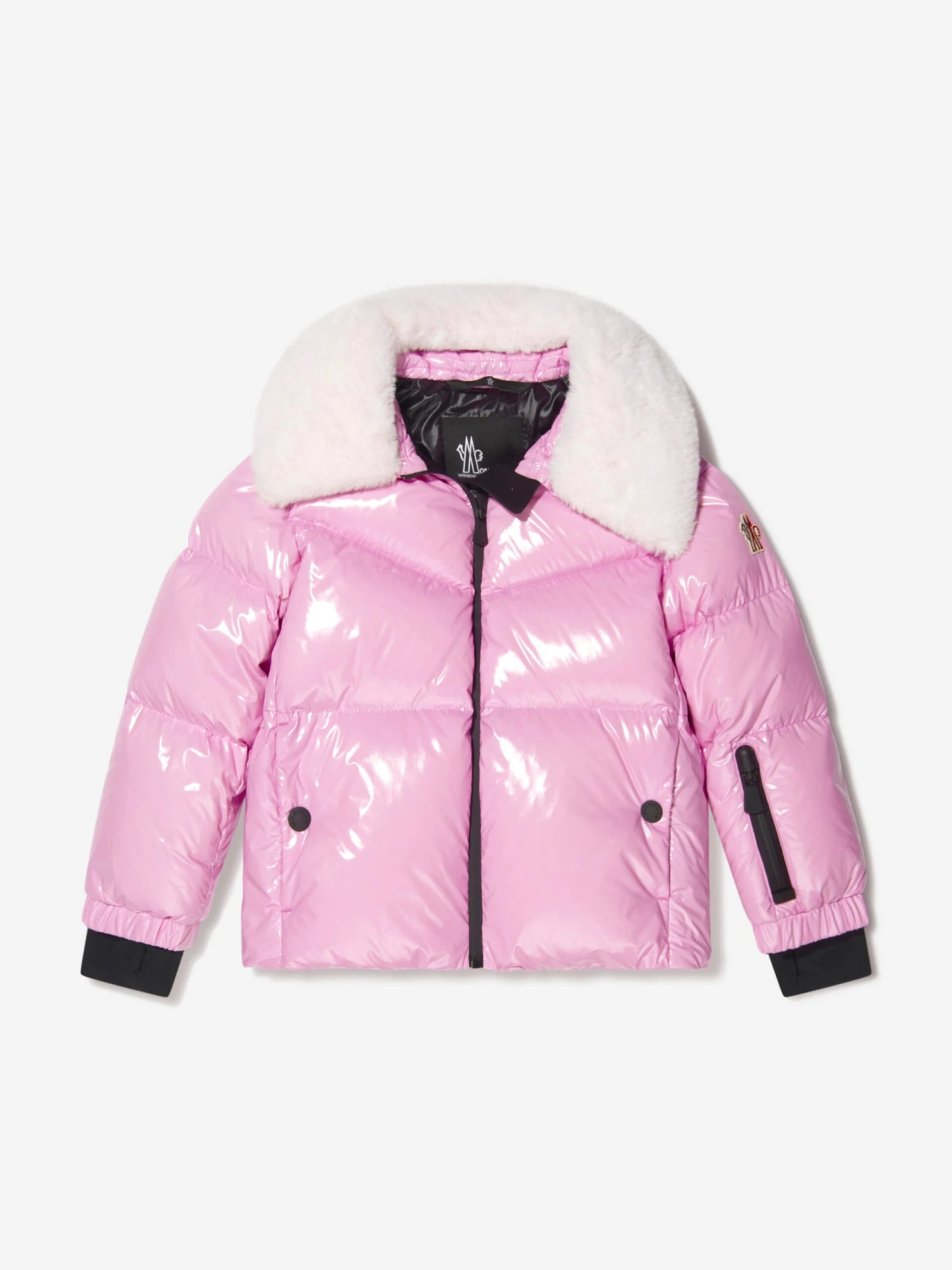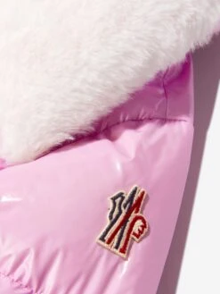 Make a style statement whilst keeping warm with this girls pink Edling jacket from Moncler. A glossy nylon laqué finish maintains style levels whilst a warm, luxe down padding keeps the cold at bay. A lush faux fur collar adds a layer of chic as well as warmth, whilst a logo patch decorates the left sleeve for this Grenoble collection piece.