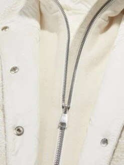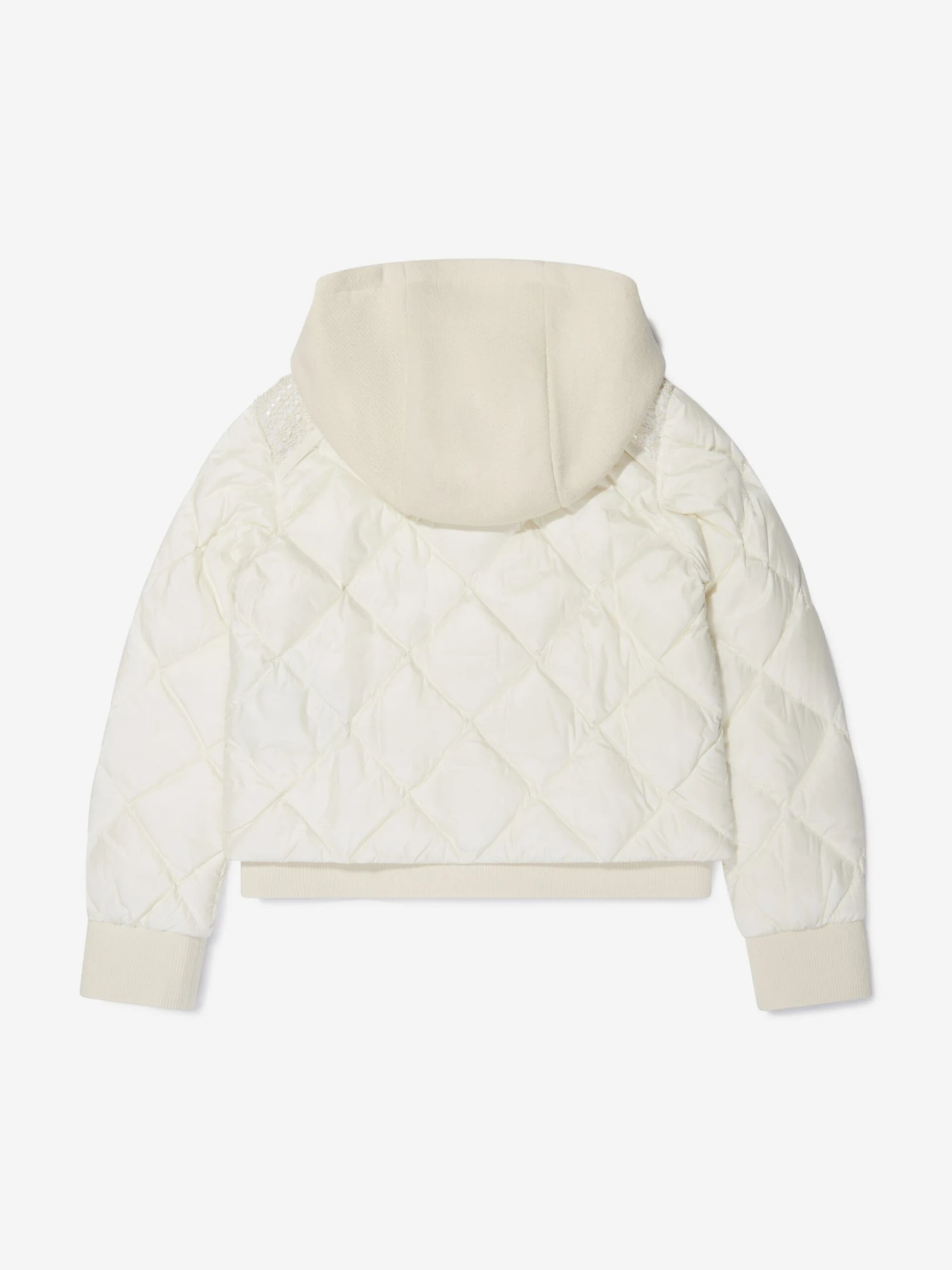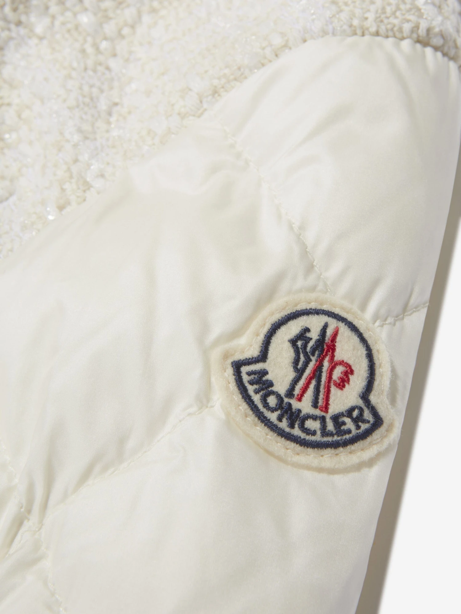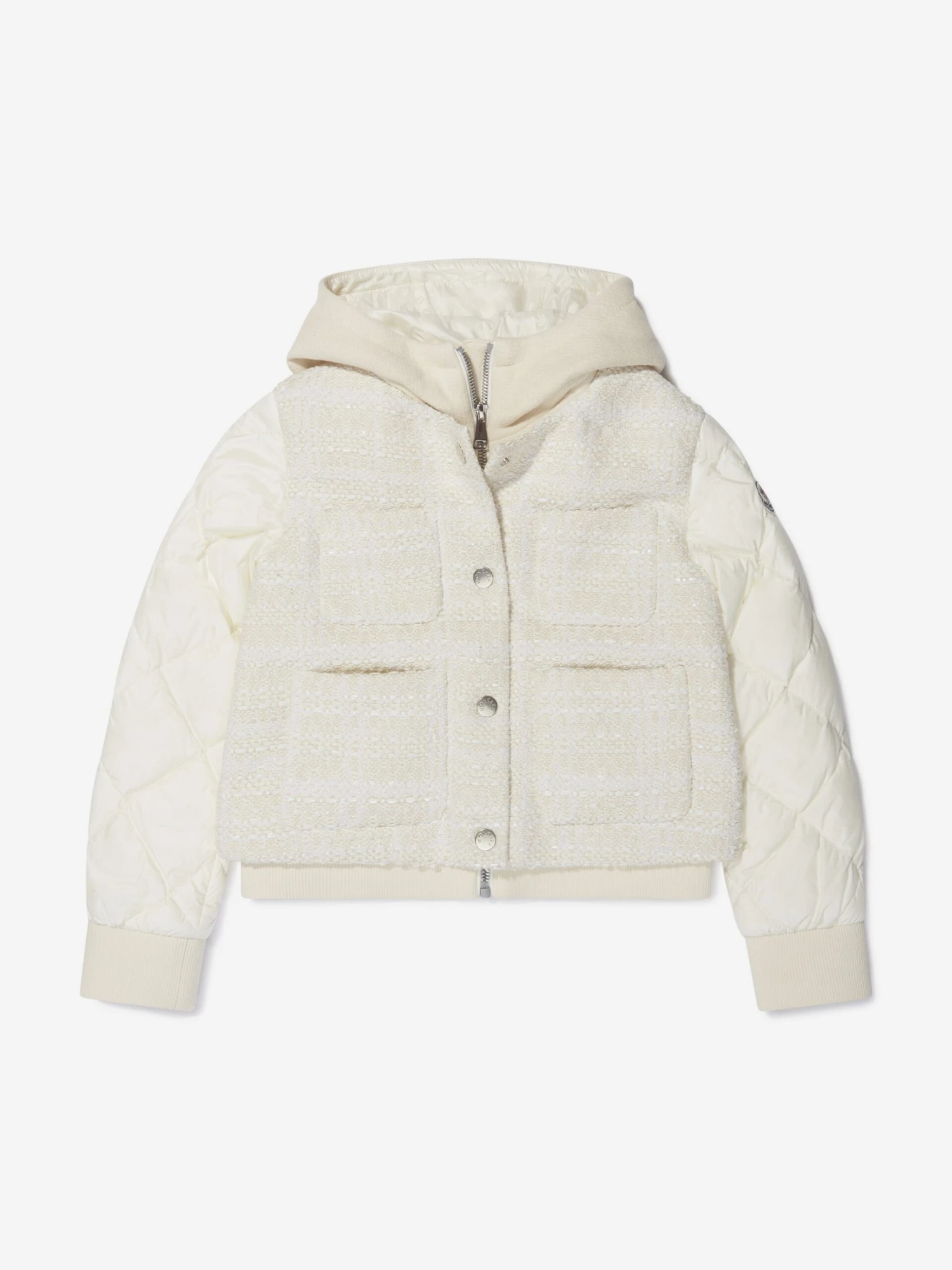 Ivory jacket for girls by French luxury designer Moncler Enfant. Made in a cotton blend, the jacket has a jersey insert and hood, with a tweed overlay glistening with shiny thread. The overlay has four patch pockets on the front and fastens with shiny silver logo poppers. With ribbed trims, the quilted sleeves and back are lightly padded with luxurious down. One sleeve has the brand’s signature logo badge.