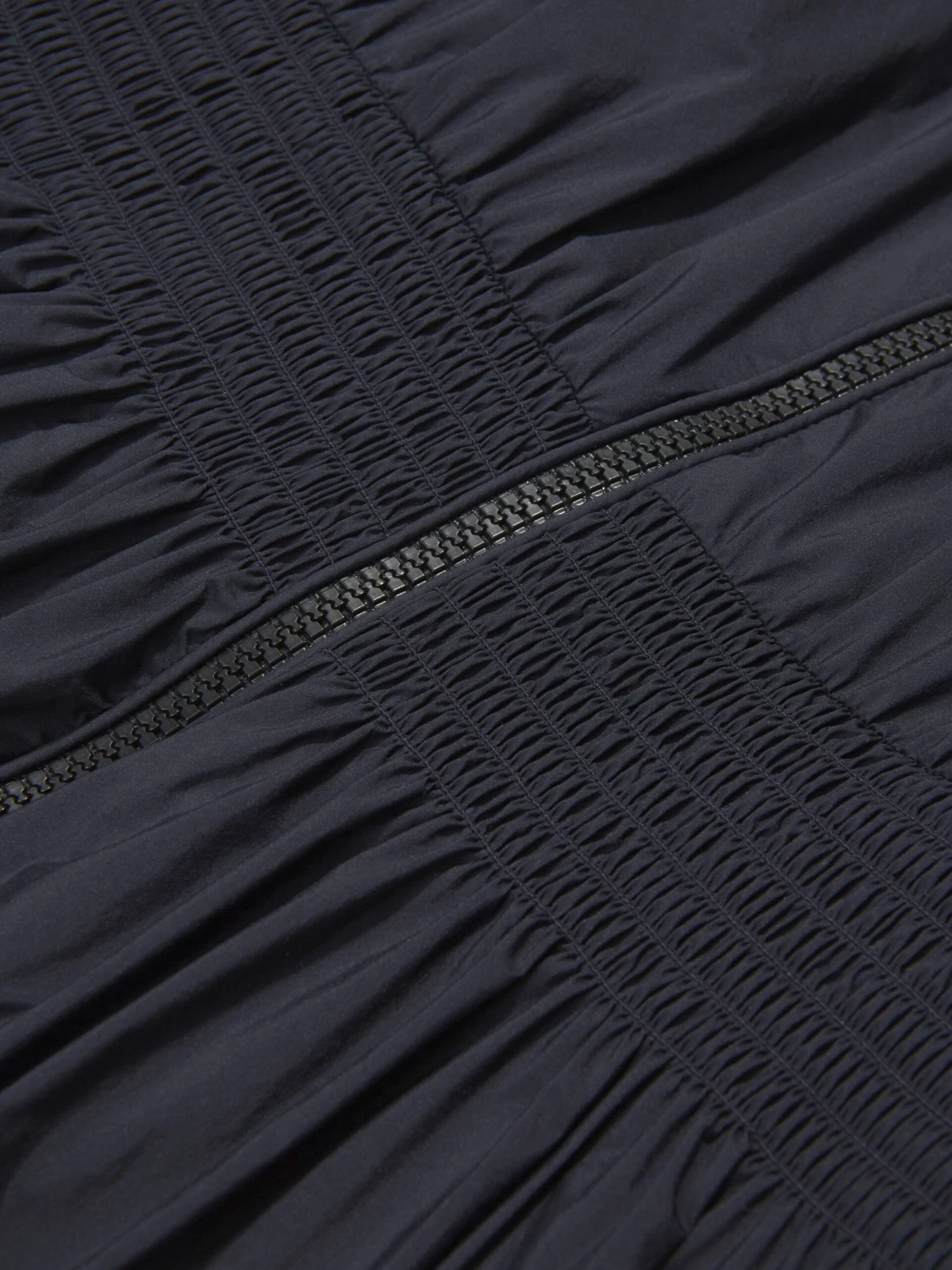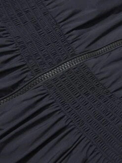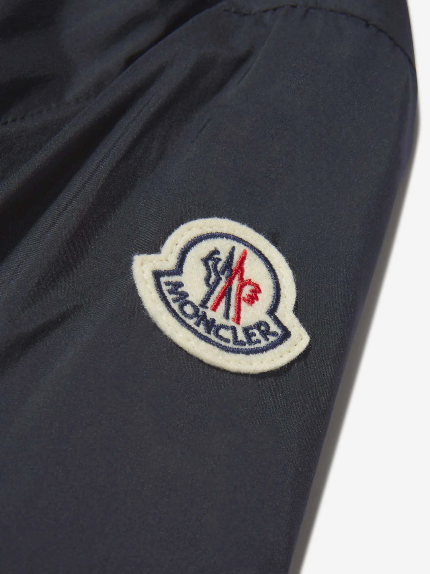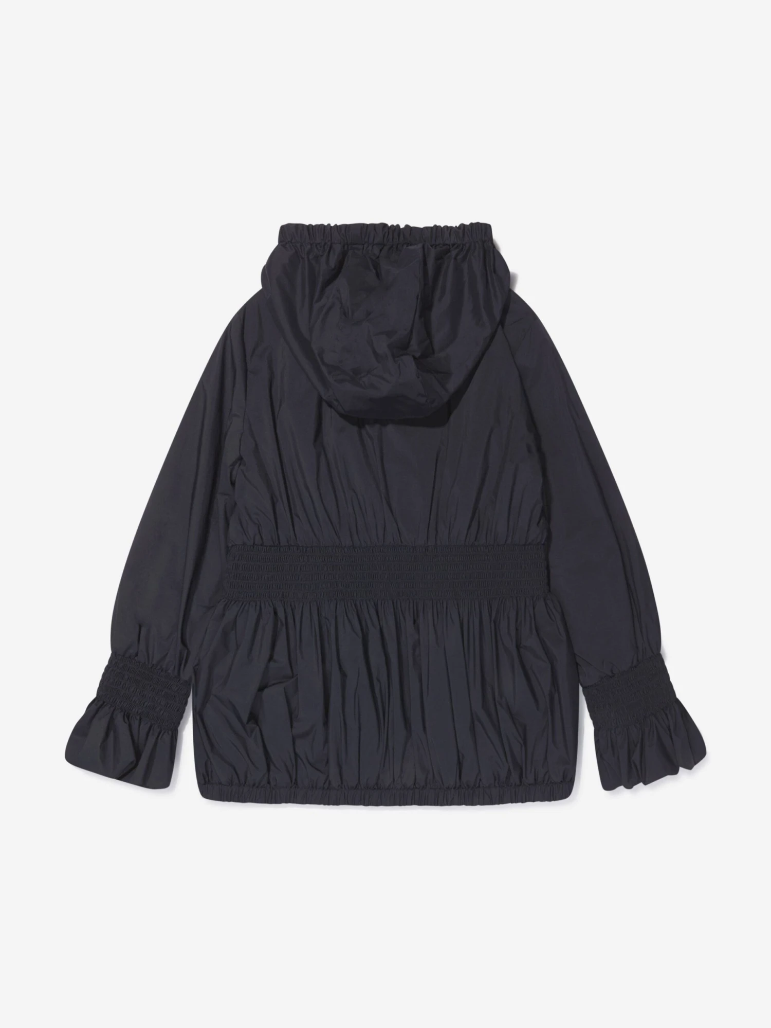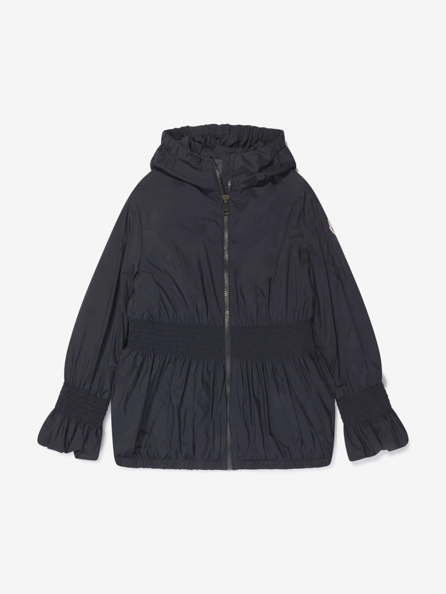 Contemporary lightweight hooded jacket for girls, by luxury French brand Moncler Enfant, made in super soft and silky nylon. Featuring the brand’s iconic felt logo patch on one sleeve, it has a stylish shirred waist for shape, and matching shirred trims on the cuffs. There are slanted popper pockets on the front and an elasticated hem.