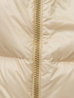 Wrap your little girl in luxury this winter with this chic Moncler Enfant coat. The luxurious cream coat has a padded bodice that is filled with down for extra warmth with knitted ribbed cream sleeves and a cosy hood for colder days. The fashionable and functional piece also has a gold metal zip fastening on the front and is completed with the Moncler logo patch on the arm.