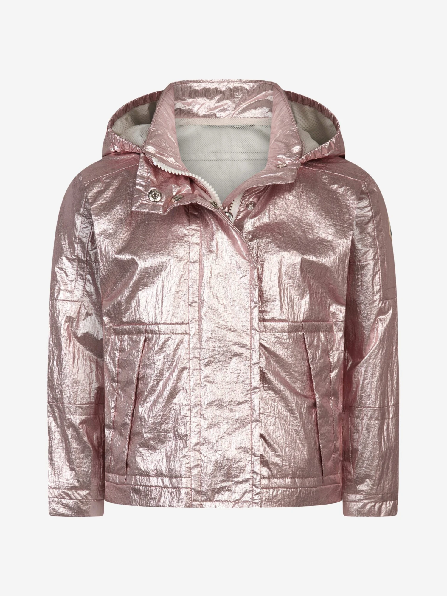 Add some shimmer to her style this season with this stunning girls’ jacket by French designer Moncler Enfant. The dazzling pink metallic windbreaker is made from lightweight nylon and lined for extra comfort. Masterfully blending fashion and function, this charming jacket also boasts a useful hood, front pockets and a zip fastening down the front with the iconic Moncler logo sewn on the arm.