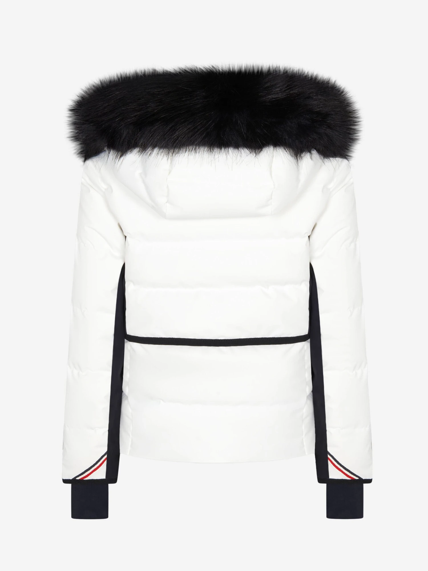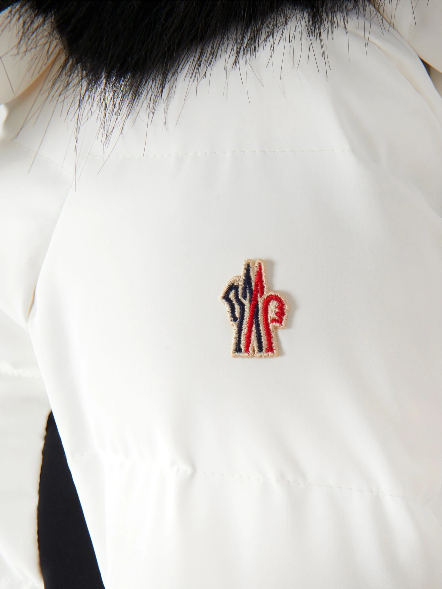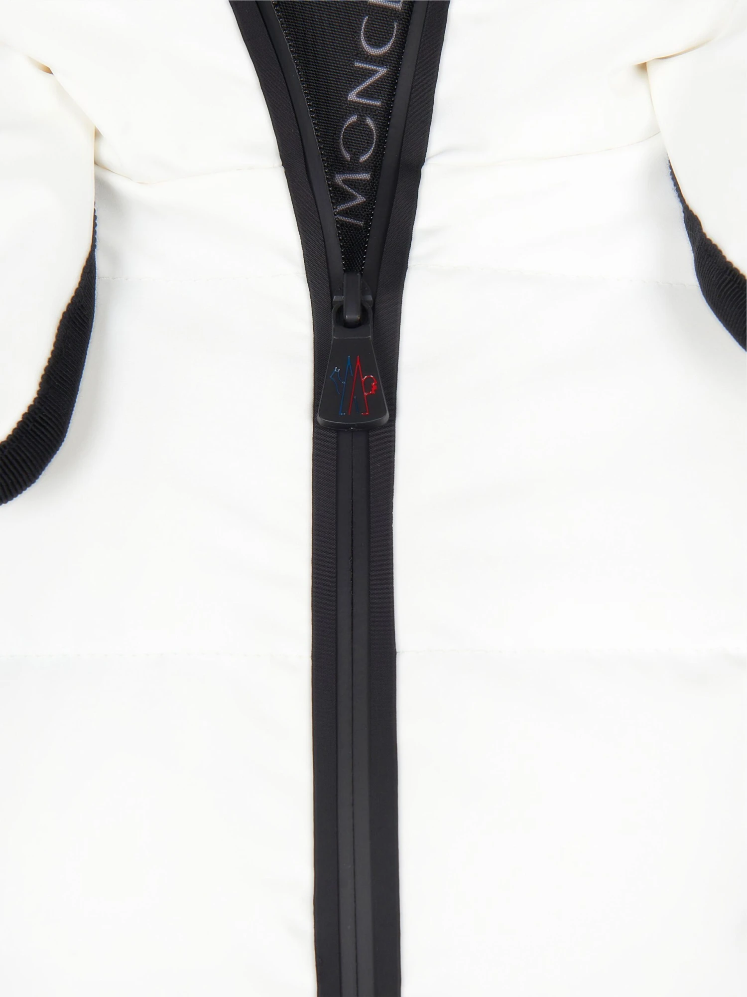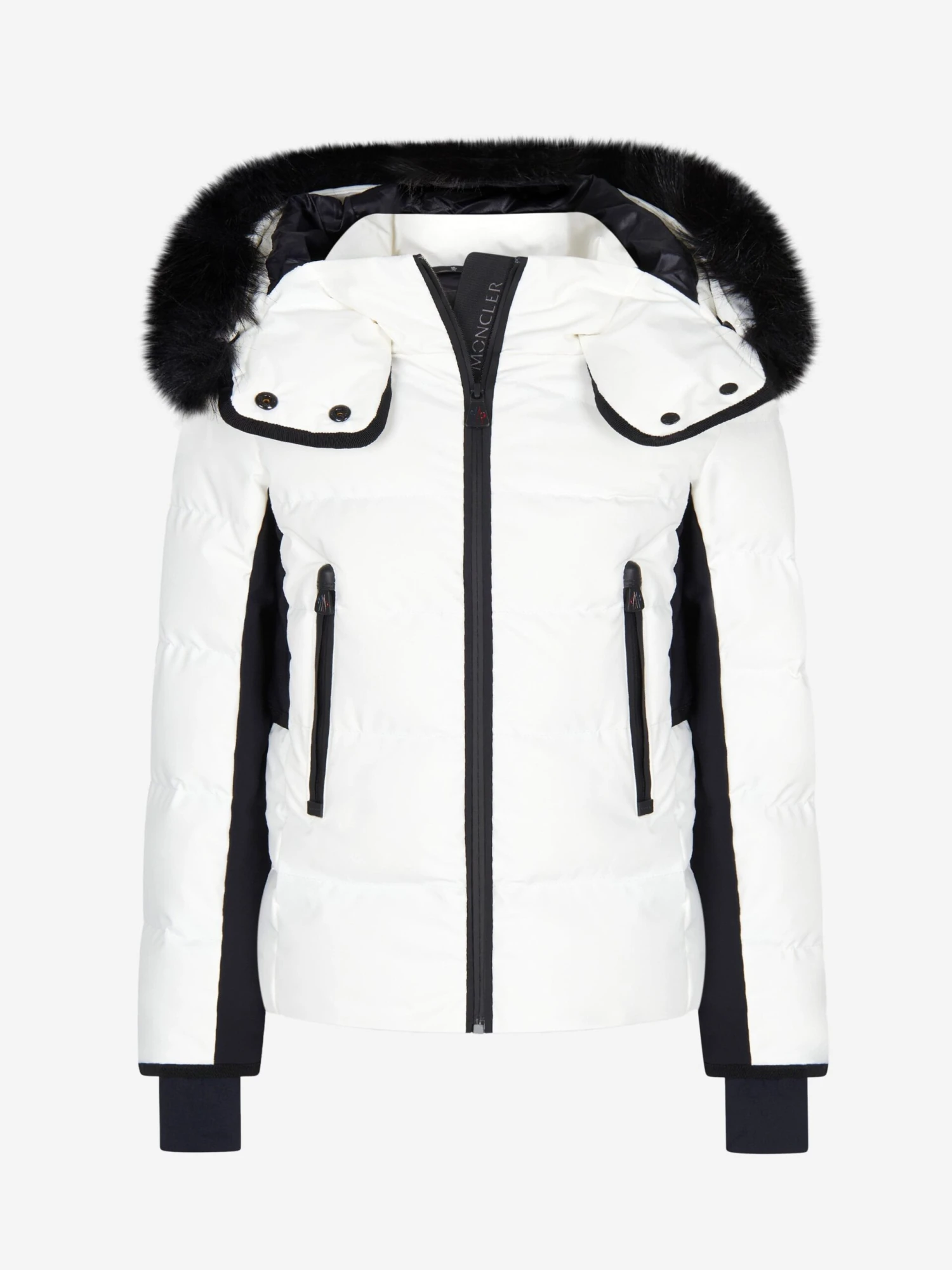 Add ski inspired style to her winter wardrobe with this girls cream padded jacket from Moncler Enfant. With padded down filled sections, warm air is trapped inside, keeping her snug throughout the day. Elasticated cuffs and a detachable real fur trim hood stop the cold from creeping in and slanted zip pockets provide a cosy sanctuary for cold hands. With Moncler embroidered motif to the arm for a chic mountain look.