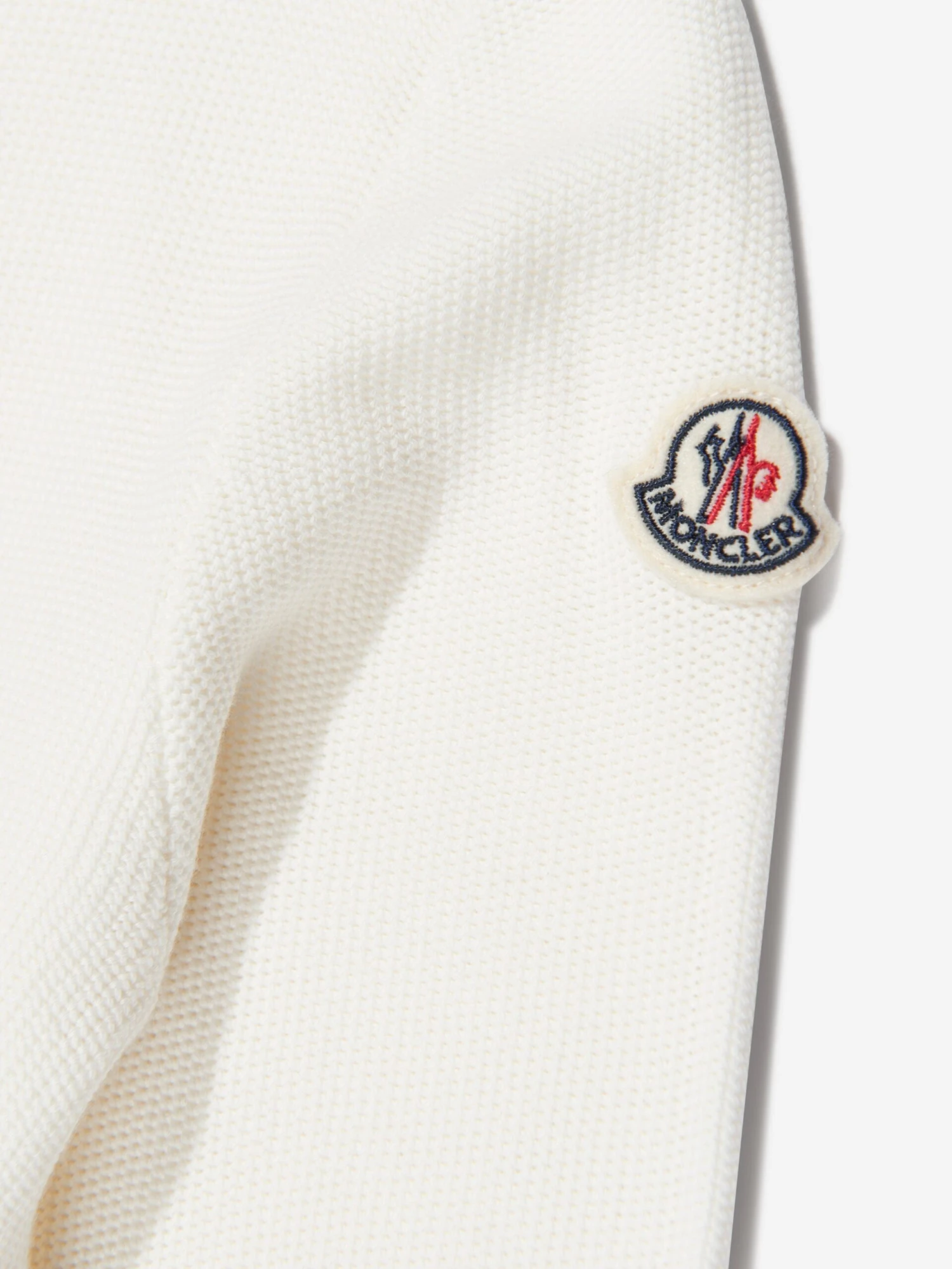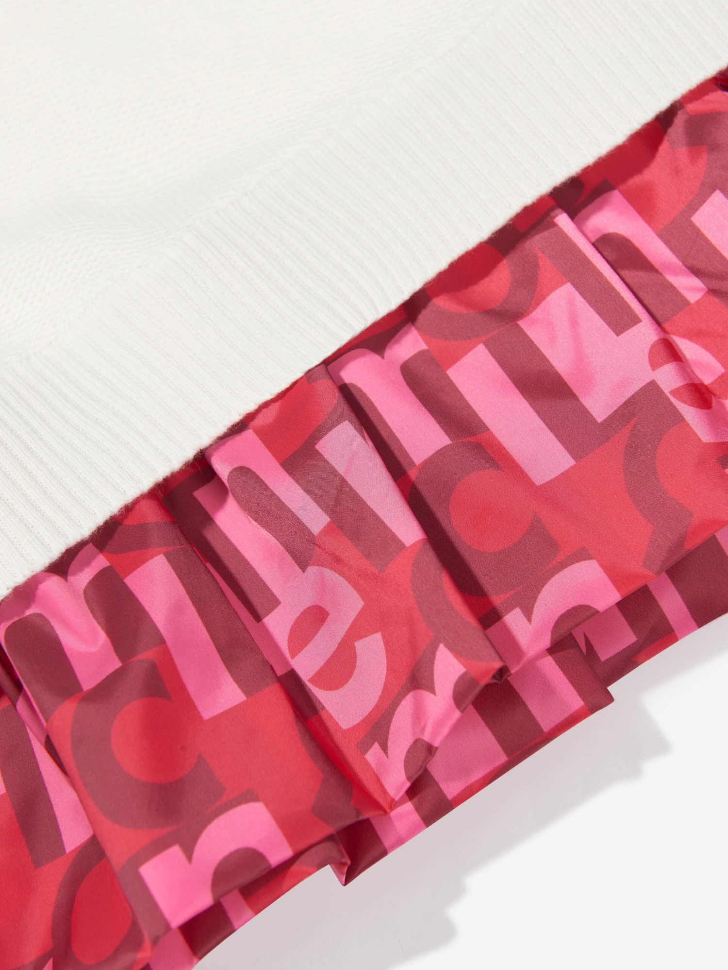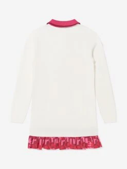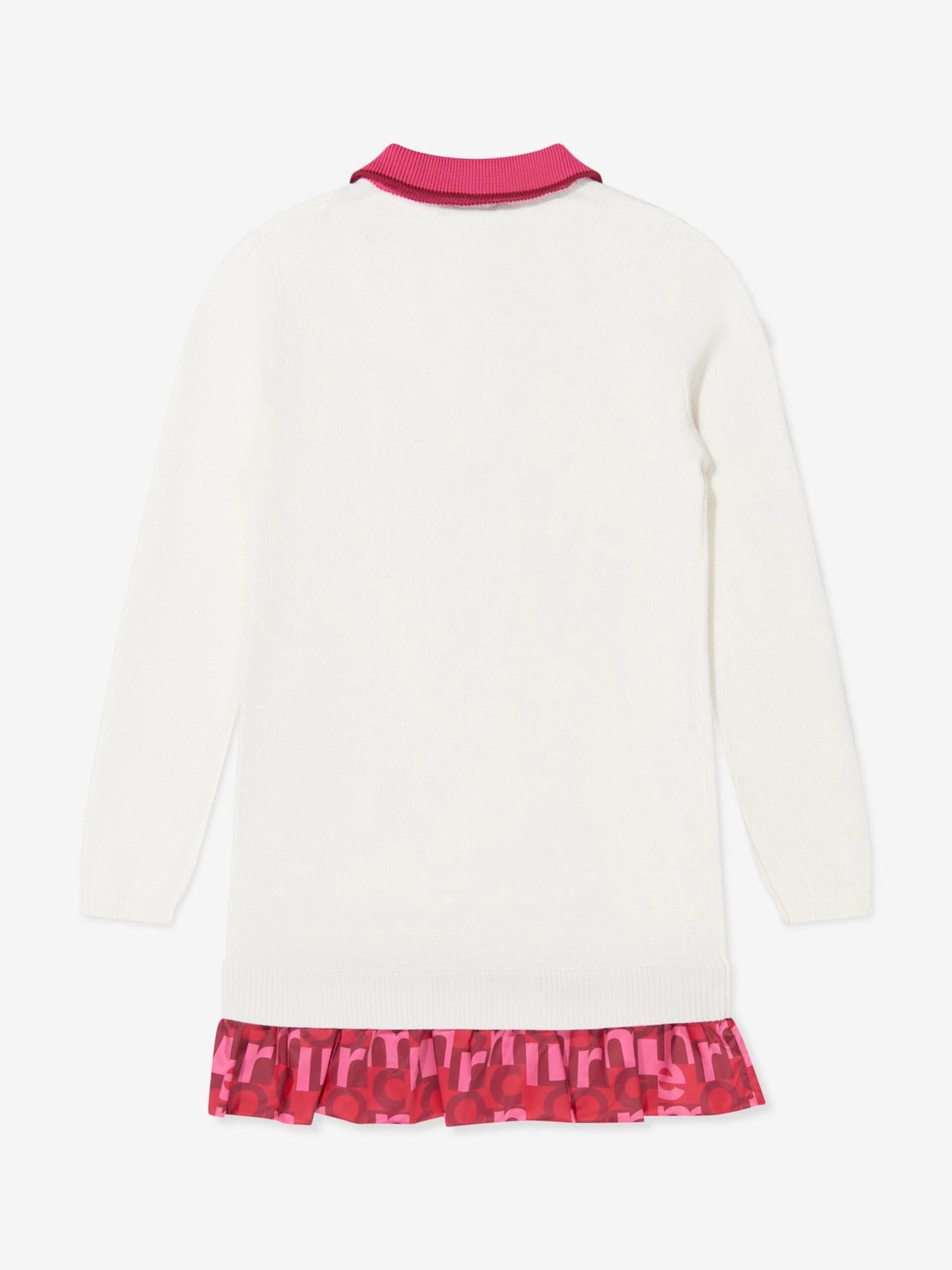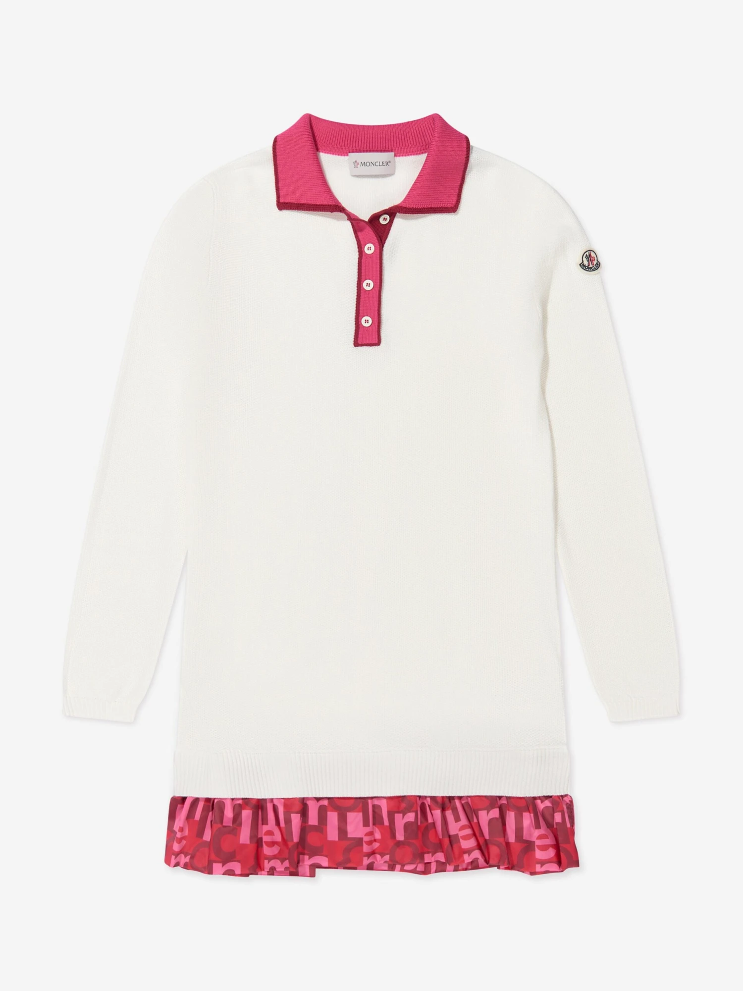 Tennis inspired aesthetics give this girls white polo dress from Moncler, a cool, casual style. The lightweight knit is crafted from a soft, comfy cotton and boasts pink accents from the ribbon button placket and collar, to the branded ruffle hem. The piece is finished with the signature logo appliqué adorning the left sleeve.