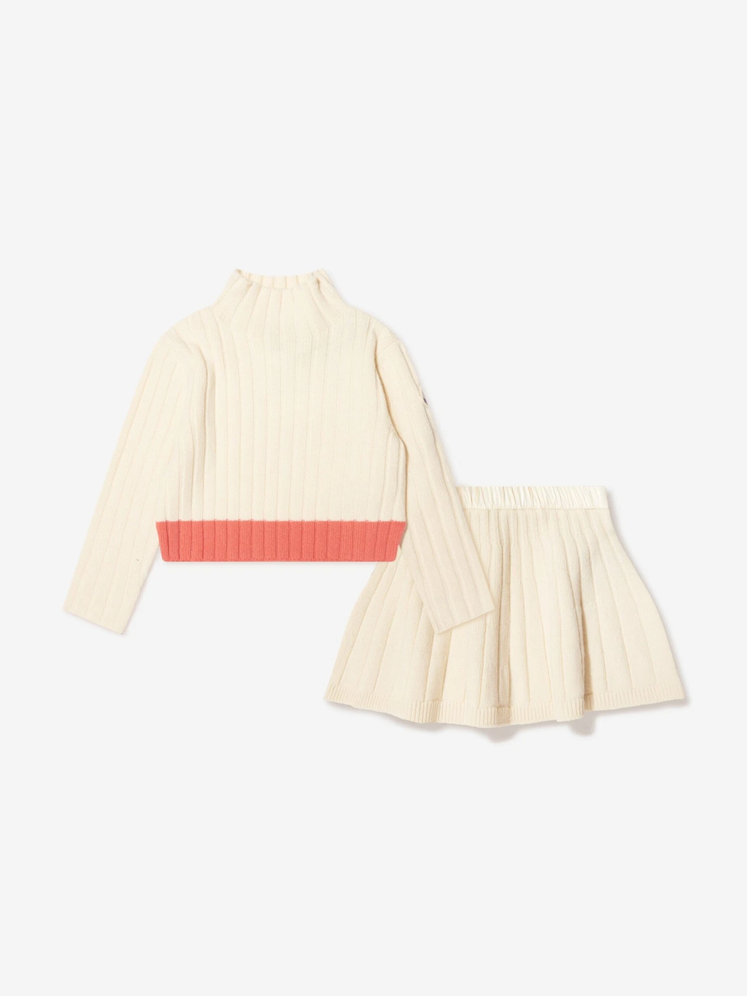 Full of Alpine elegance, this girls 2-piece knitted jumper and skirt set from Moncler offers chic and sophisticated everyday wear. A lush, warm wool blend is presented in rib-knit design across both elements. A turtleneck top features a coral and pale blue hued hem with the iconic felt badge adorning the left sleeve, whilst the matching skirt sports a satin waistband and logo tab on the reverse.