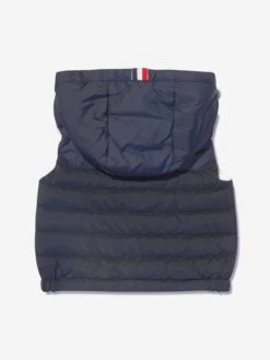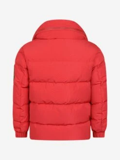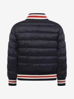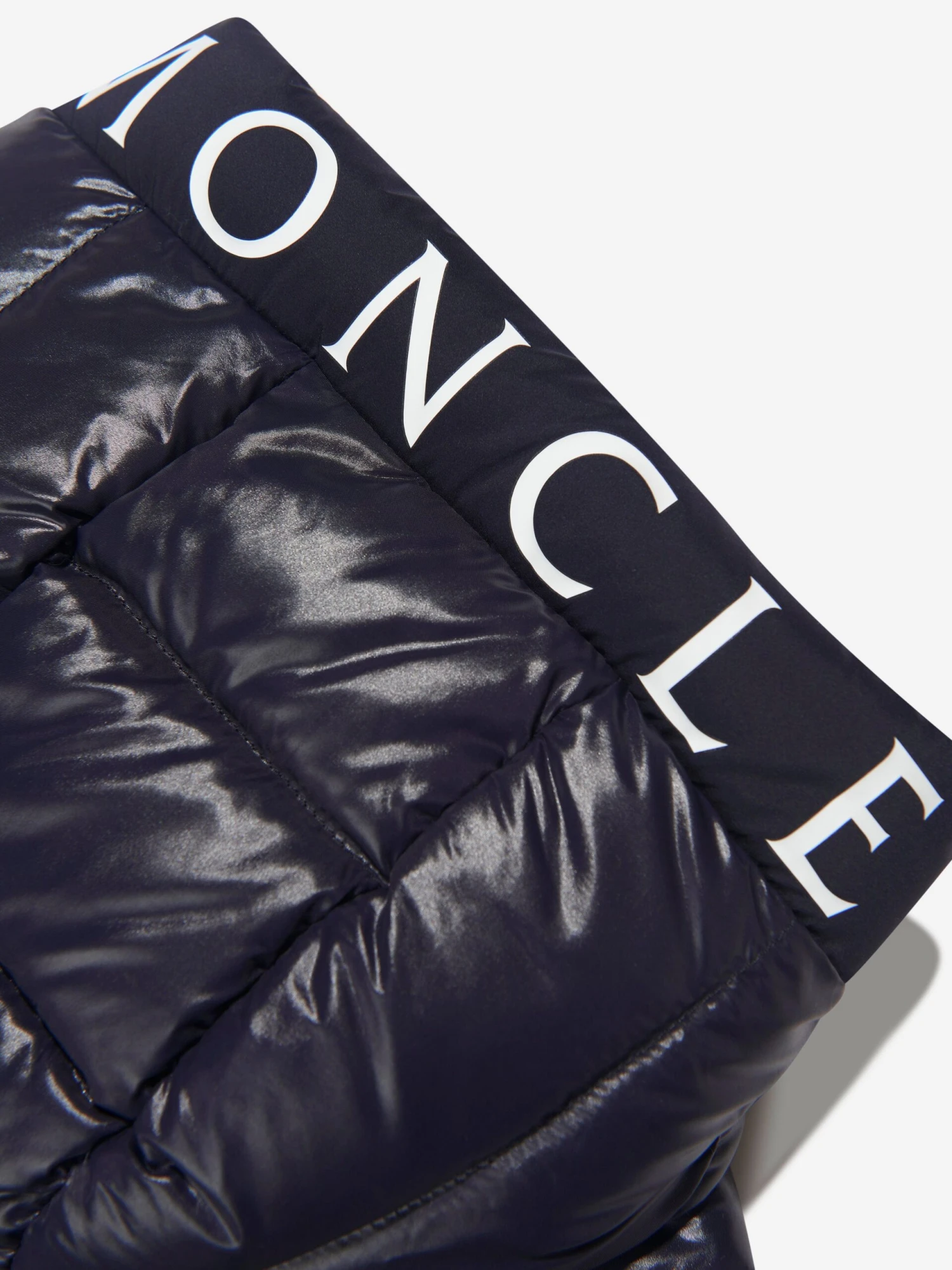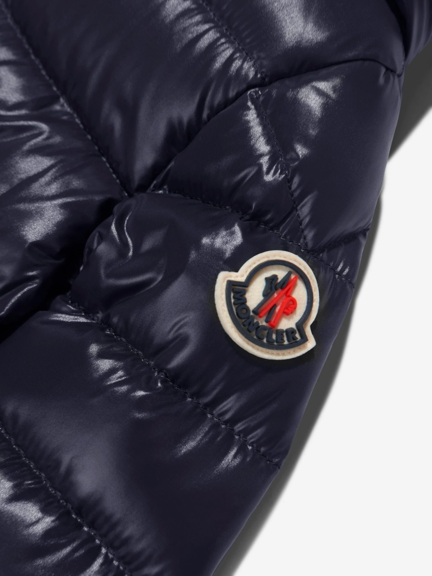 Ski smarts meet city living with this kids down padded navy Salzman jacket from Moncler. The clean, shiny nylon laqué exterior houses an ultra-warm and luxe down padding, whilst an attractive logo print appears on the hood and the iconic logo badge decorates the left sleeve.