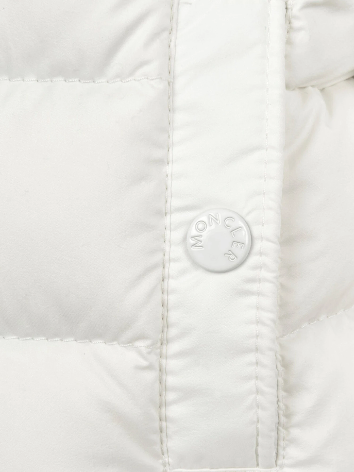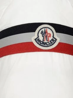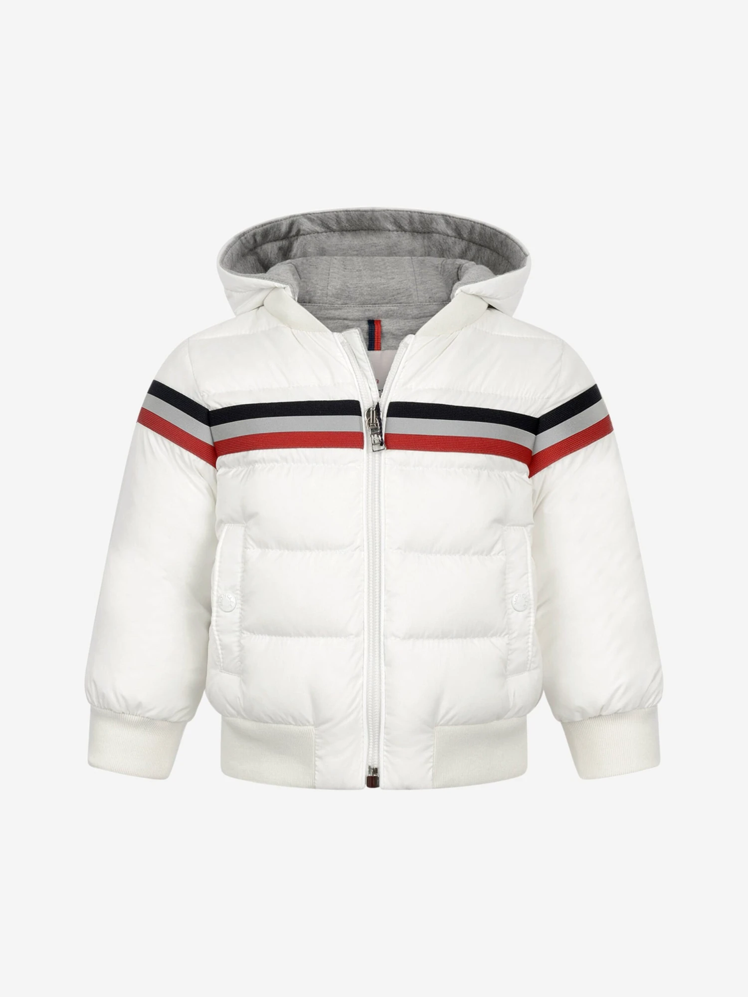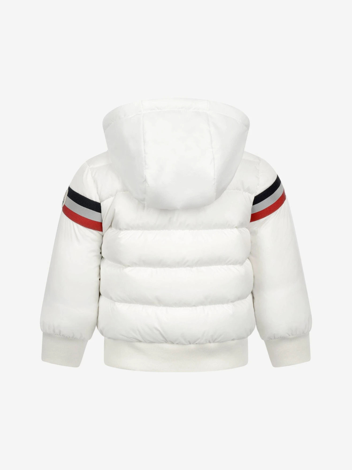 Baby boys white down padded jacket from Moncler featuring a contrast banner tricolour trim across the chest and sleeves and finished with the iconic badge applique on the sleeve.