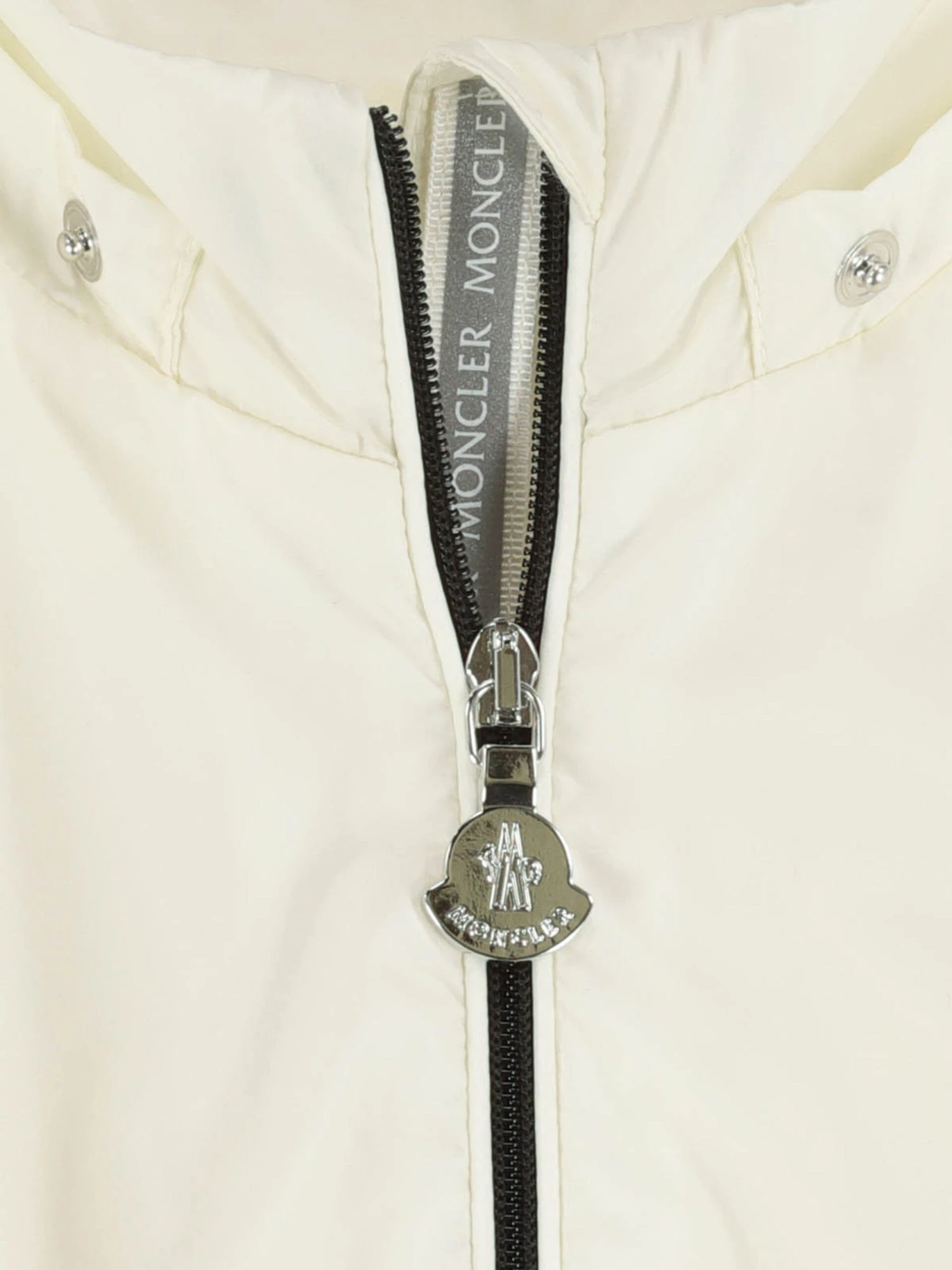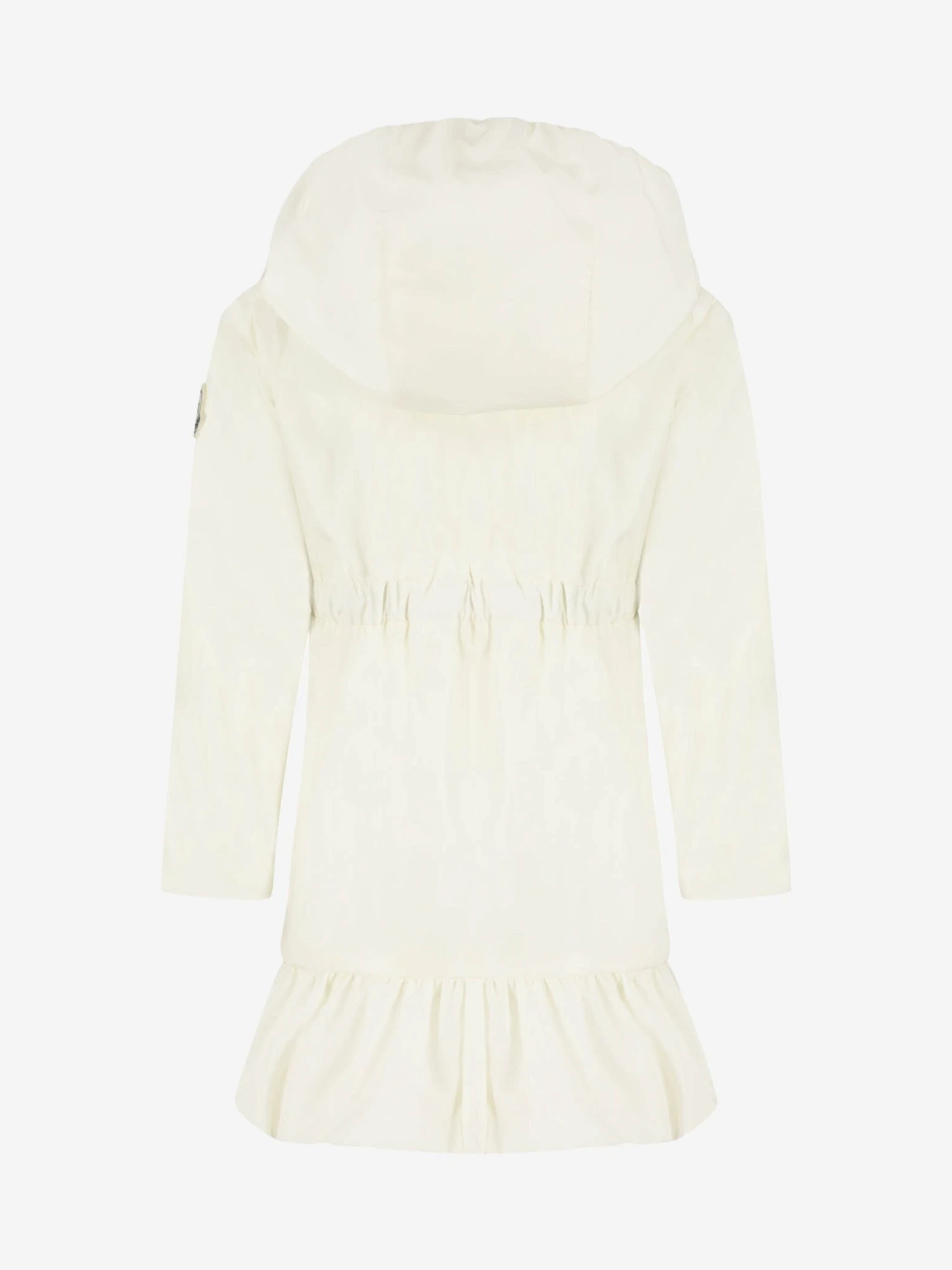 Moncler baby girls jacket in fuchsia with detachable buttoned hood. Features elasticated cuffs, hood and midriff and a cute bubble hemline.