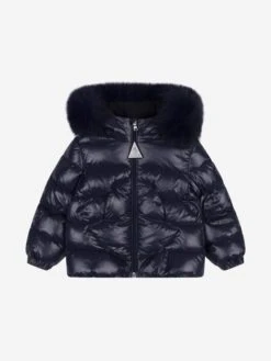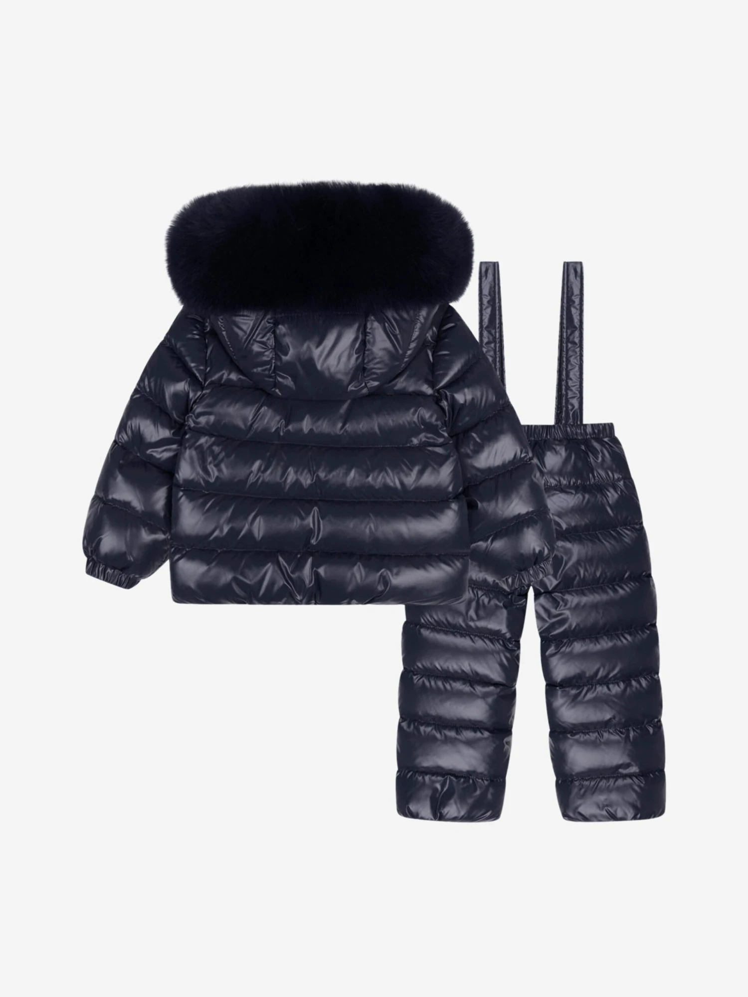 Big coverage for little loves, this baby girls down padded navy snow suit from Moncler incorporates a jacket featuring a zip closure, a removable fur trim on the hood, a badge outline split kangaroo pocket on the front and a tonal badge applique on the sleeve, whilst the matching dungarees has a branded tab on the seam and badge outline stitching on the knees. **This product contains real fur**