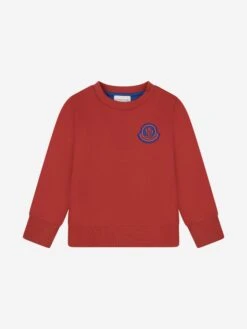 Sporty and stylish this boys white cotton tracksuit from Moncler features a red crewneck sweatshirt and blue 2-pocket jogging bottoms. Both featuring ribbed trims and contrasting rubberised badge appliques.