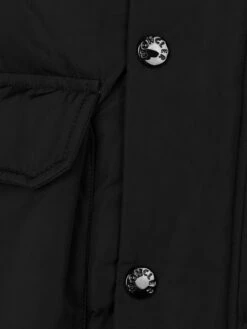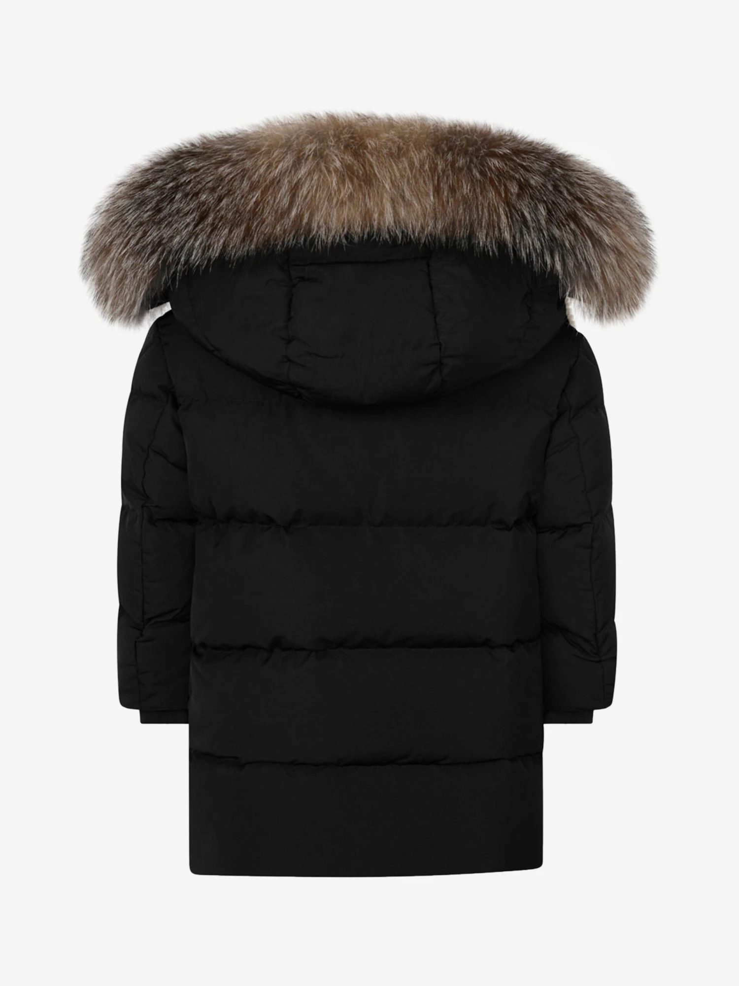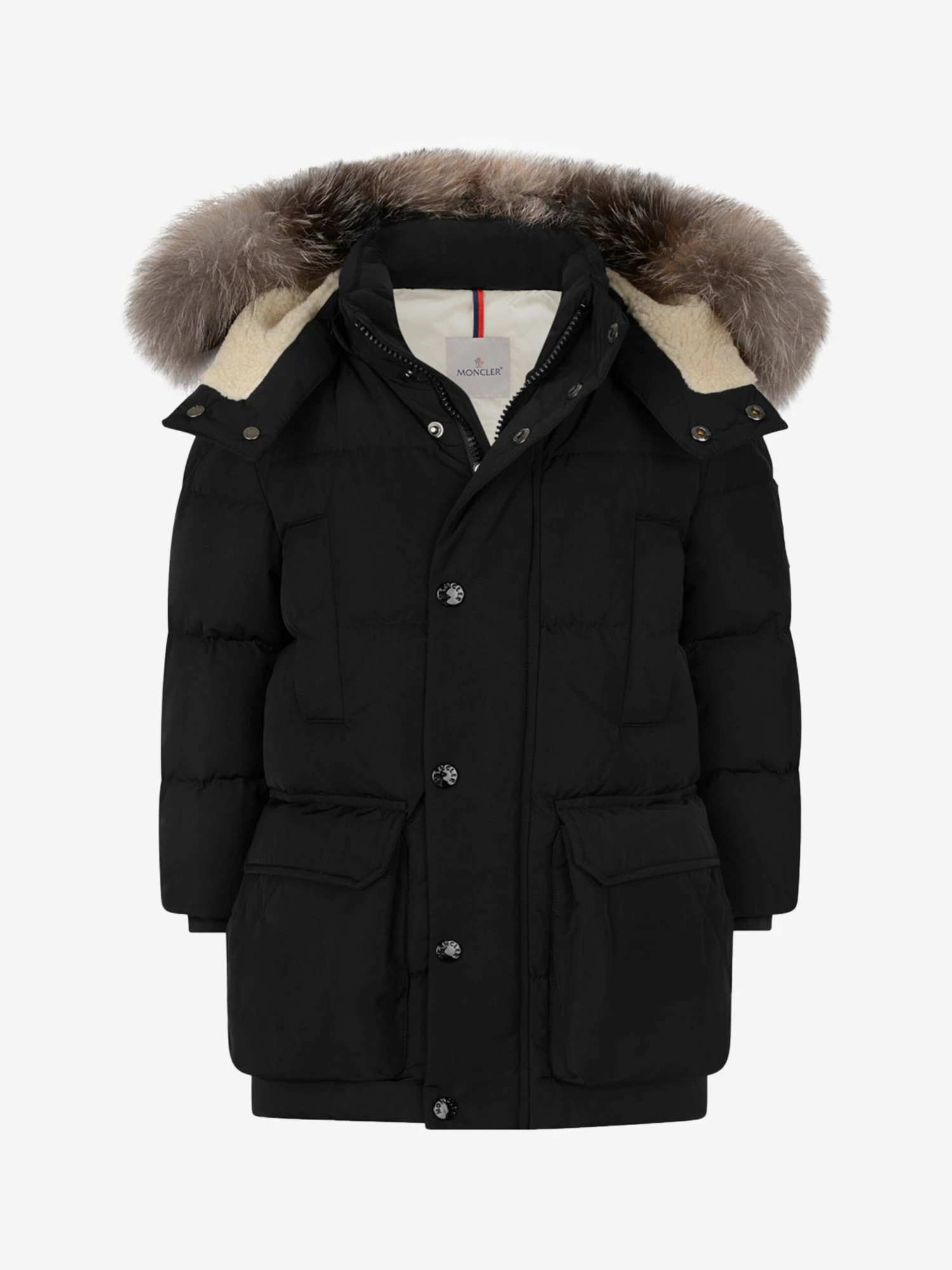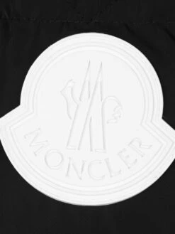 This boys black down padded jacket from Moncler features a detachable fur trim on the hood and fleece lining. With branded embossed snap press buttons and zip closure. A rubberised Moncler badge sits on the sleeve. **This item contains real fur**