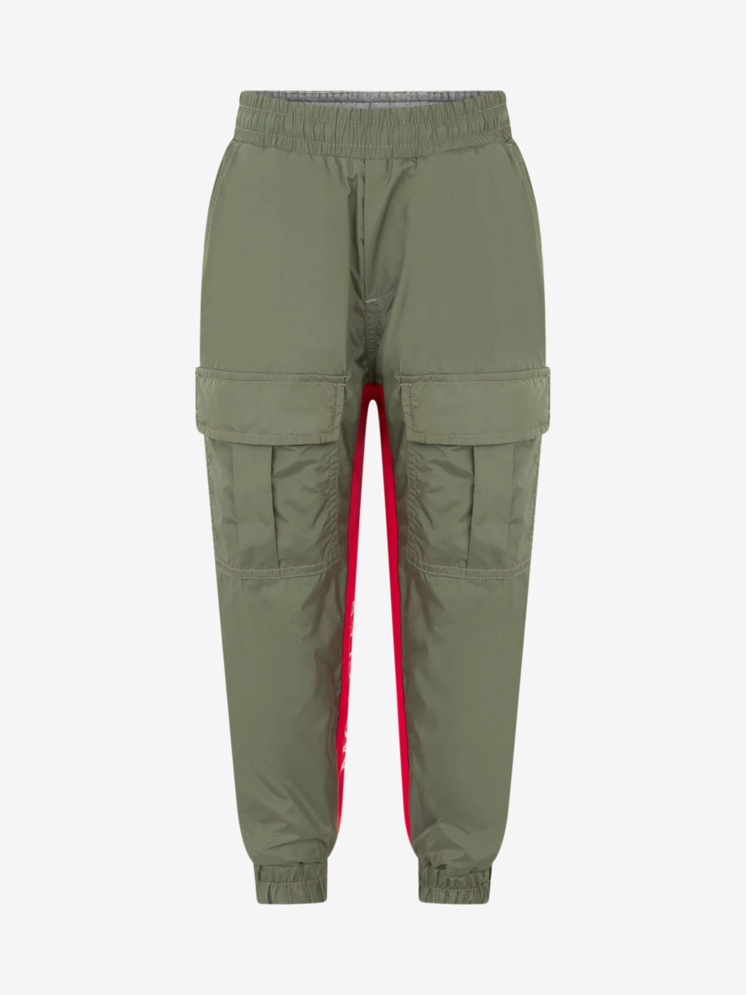Sporty and stylish, these boys khaki tracksuit bottoms from Moncler features elasticated cuffs, practical pockets, an internal red drawstring, inside seam red trim with white branding and the iconic badge applique on the reverse.