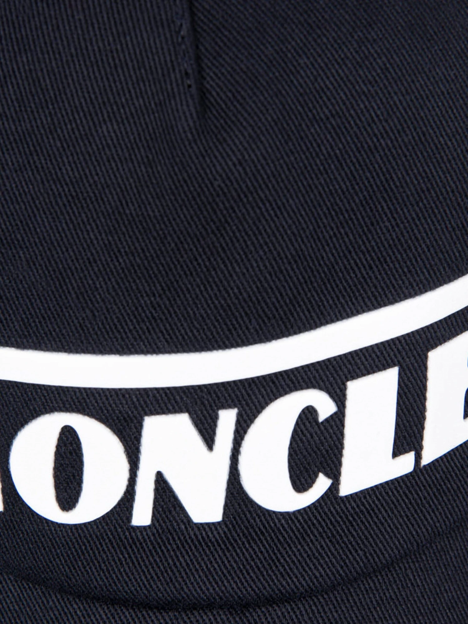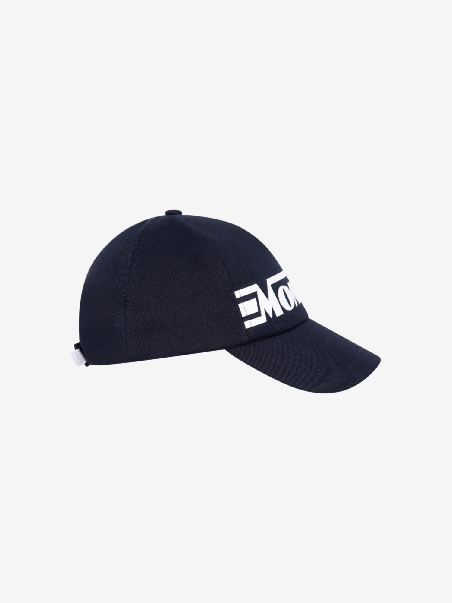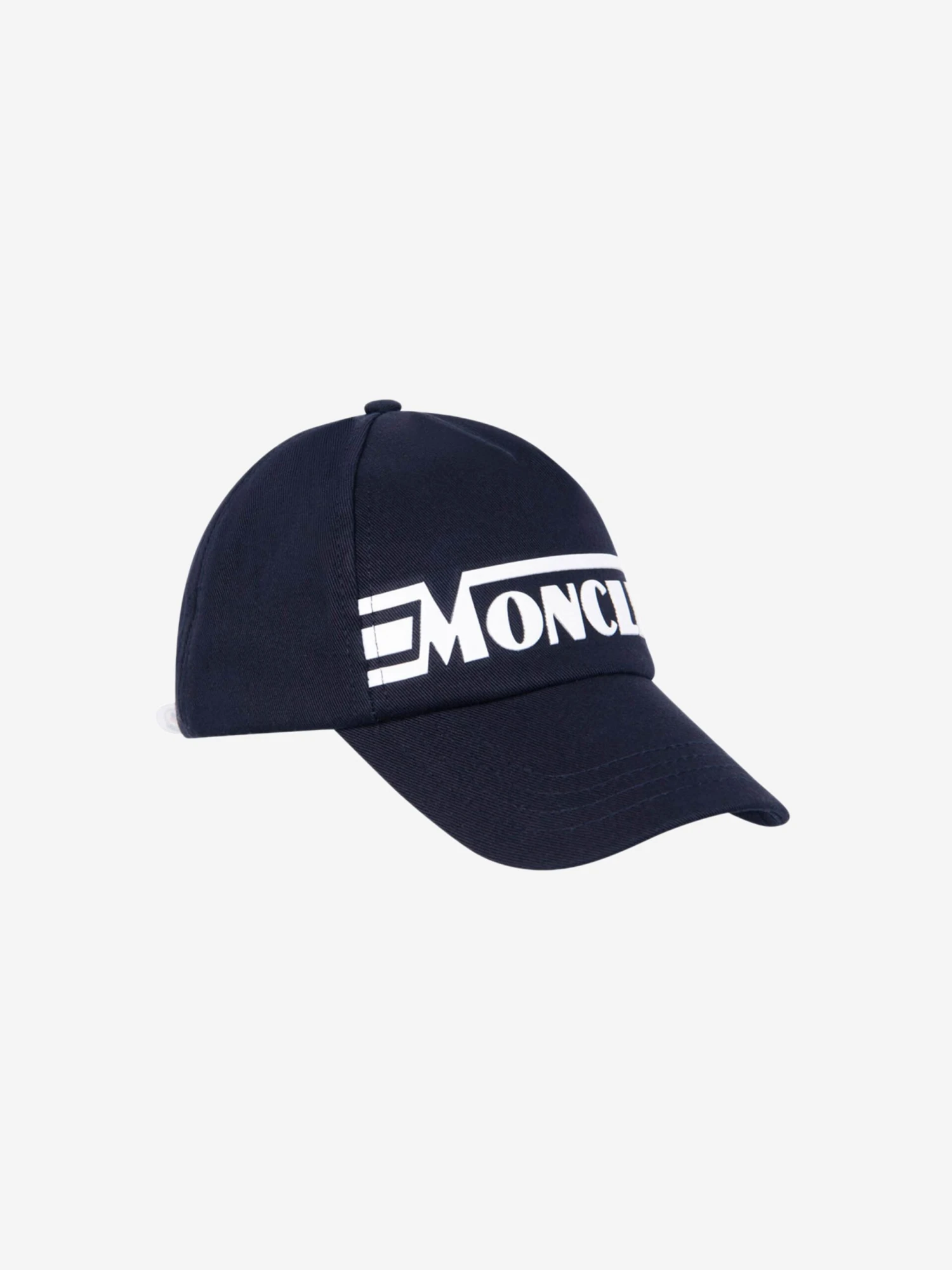 Boys navy cotton cap from Moncler featuring a contrast white textured banner logo on the front and a branded clasp on the reverse.