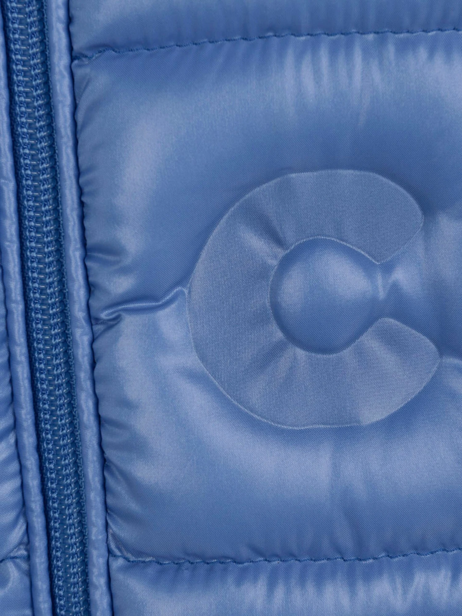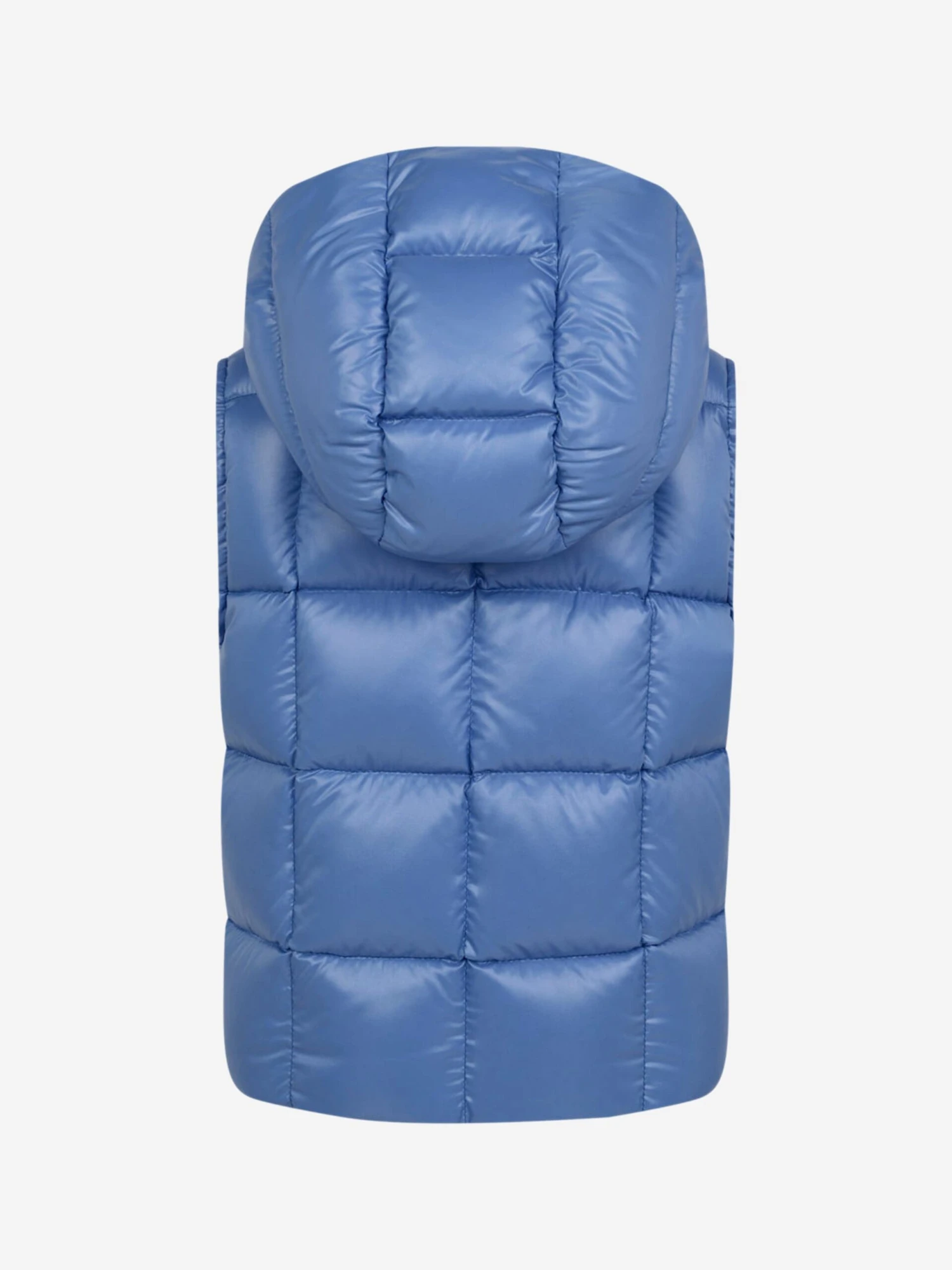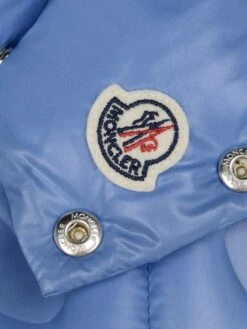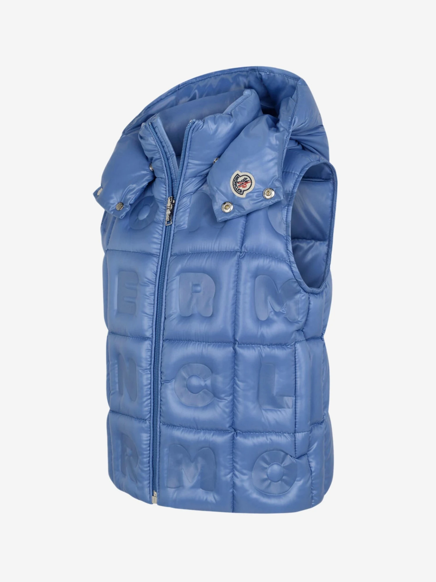 Love luxurious layers this season with this kids light blue warm down padded gilet from Moncler featuring a detachable hood and a smart tonal embossed block logo on the front as well as the iconic badge applique on the hood.