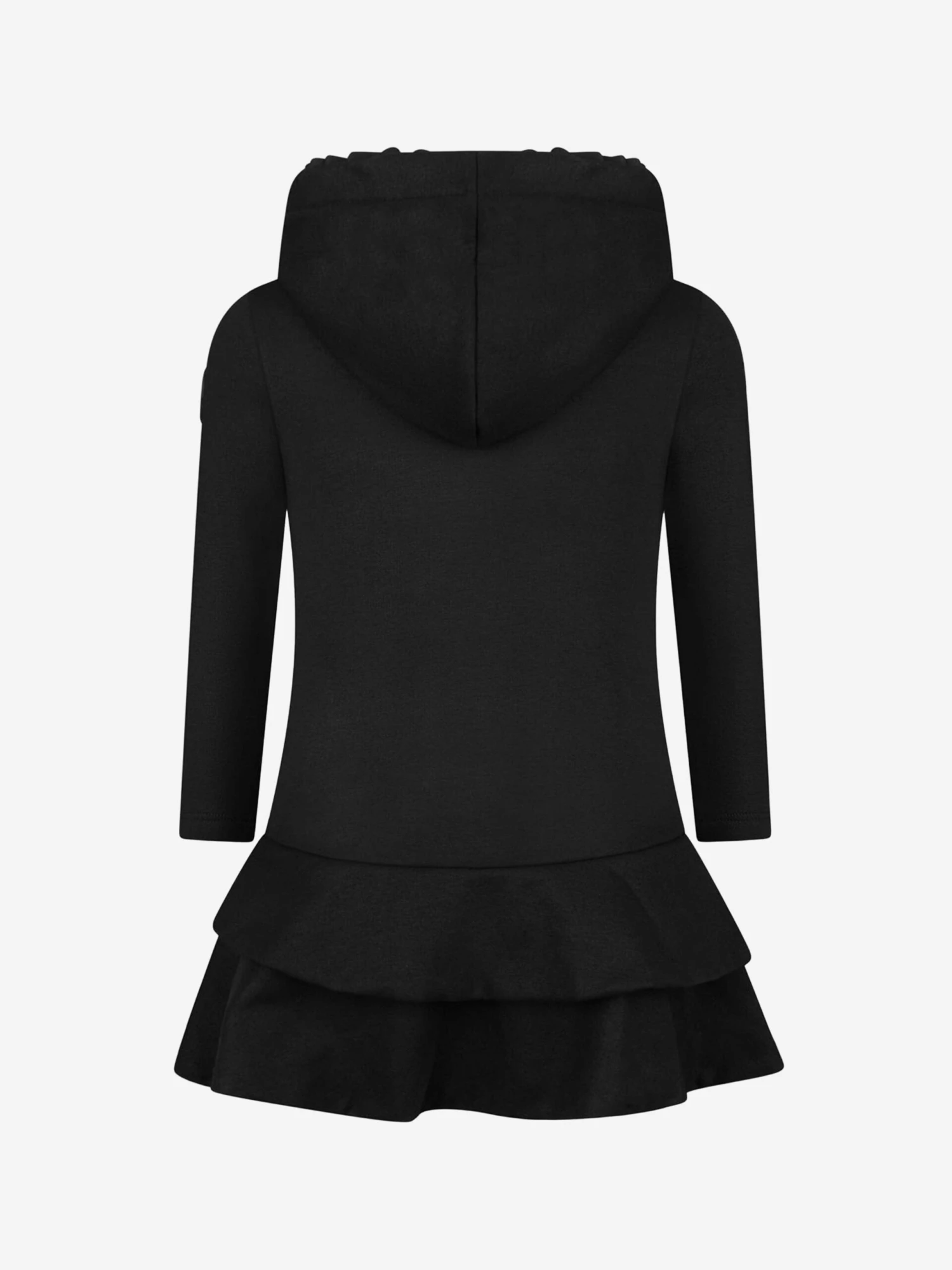 Girls black dress from Moncler featuring an attached hood with ruffled trim layer and tonal drawstring ribbon, a tonal rubberised badge applique on the sleeve and a multi-layered ruffled hem.