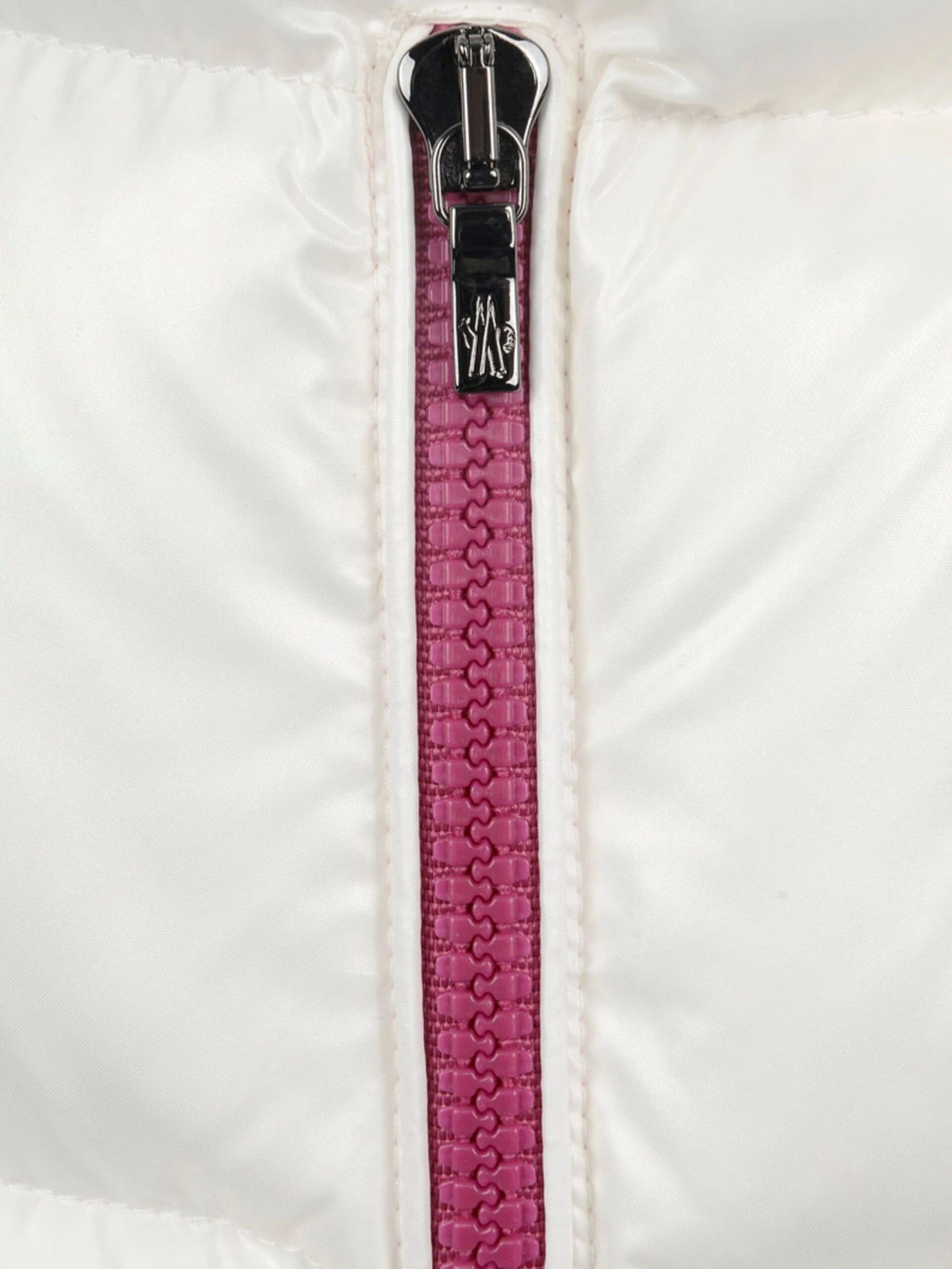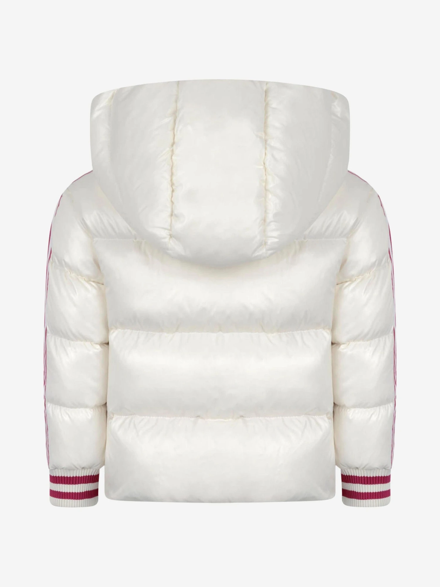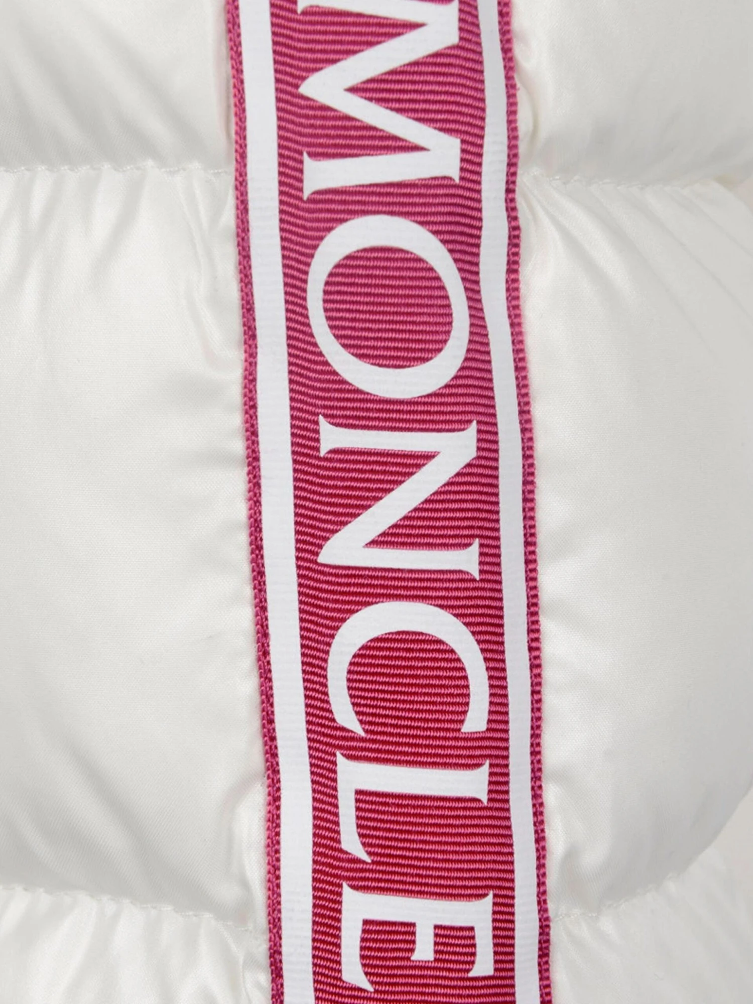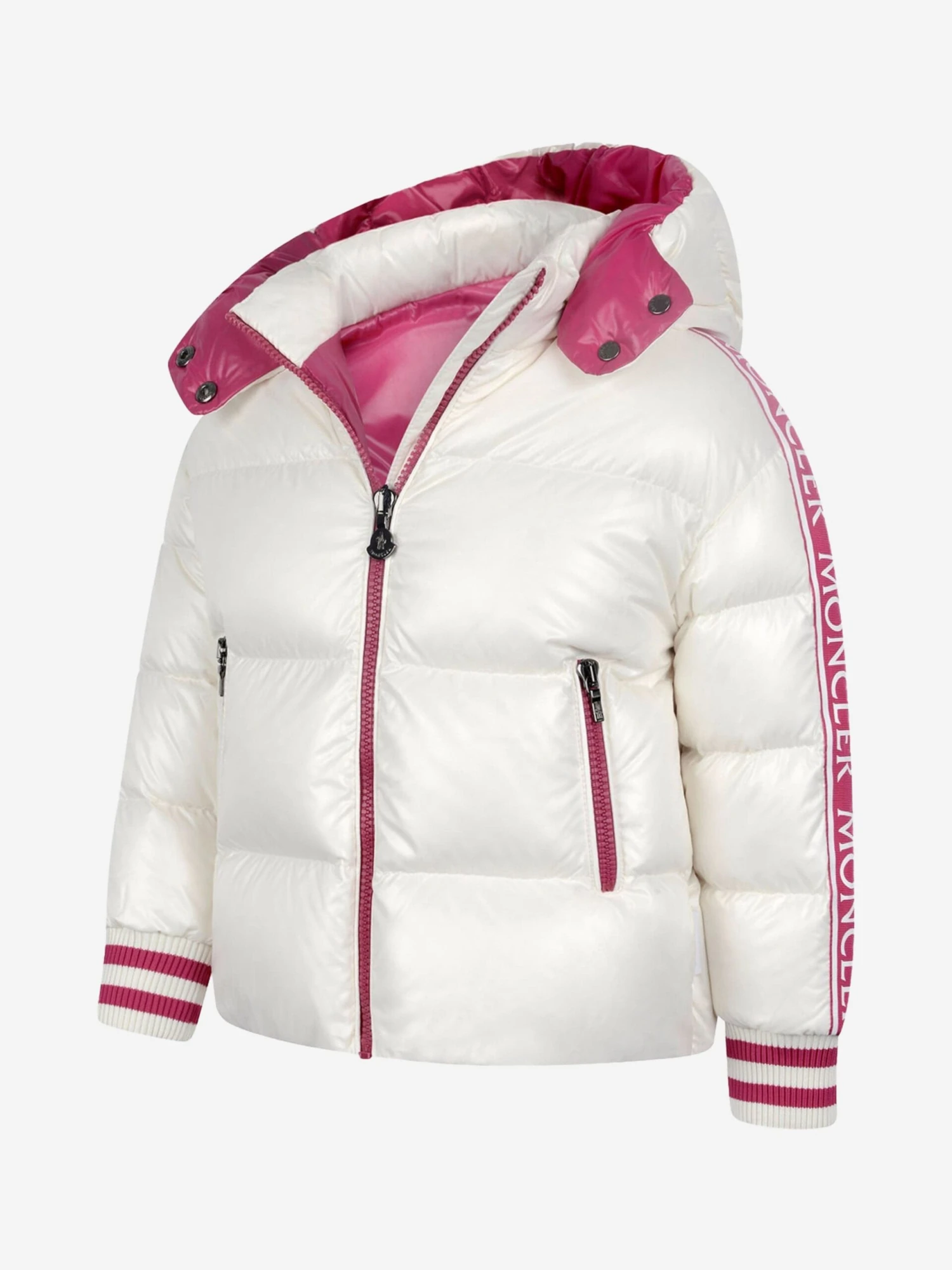 Sublime ski style this girls’ warm down padded jacket from Moncler features a detachable hood with wind guard and contrast interior, zip closures, elasticated hem, striped ribbed cuffs and branded ribbon trim on the sleeves.