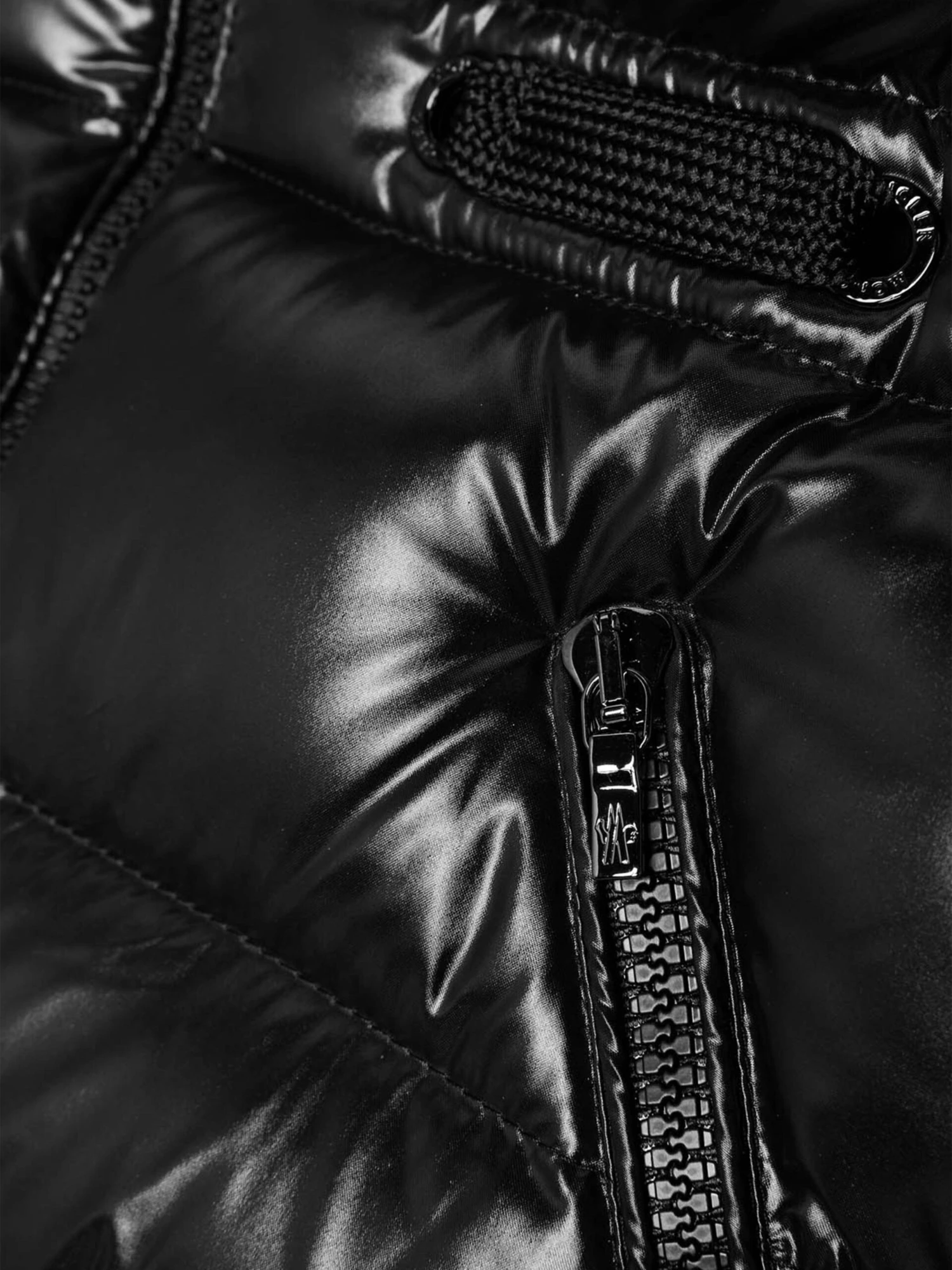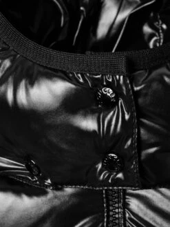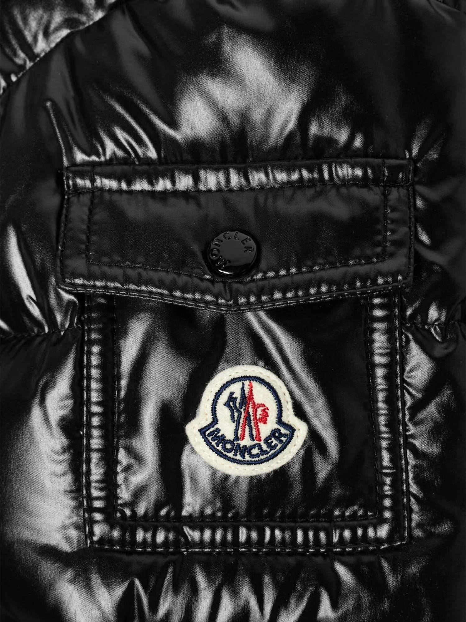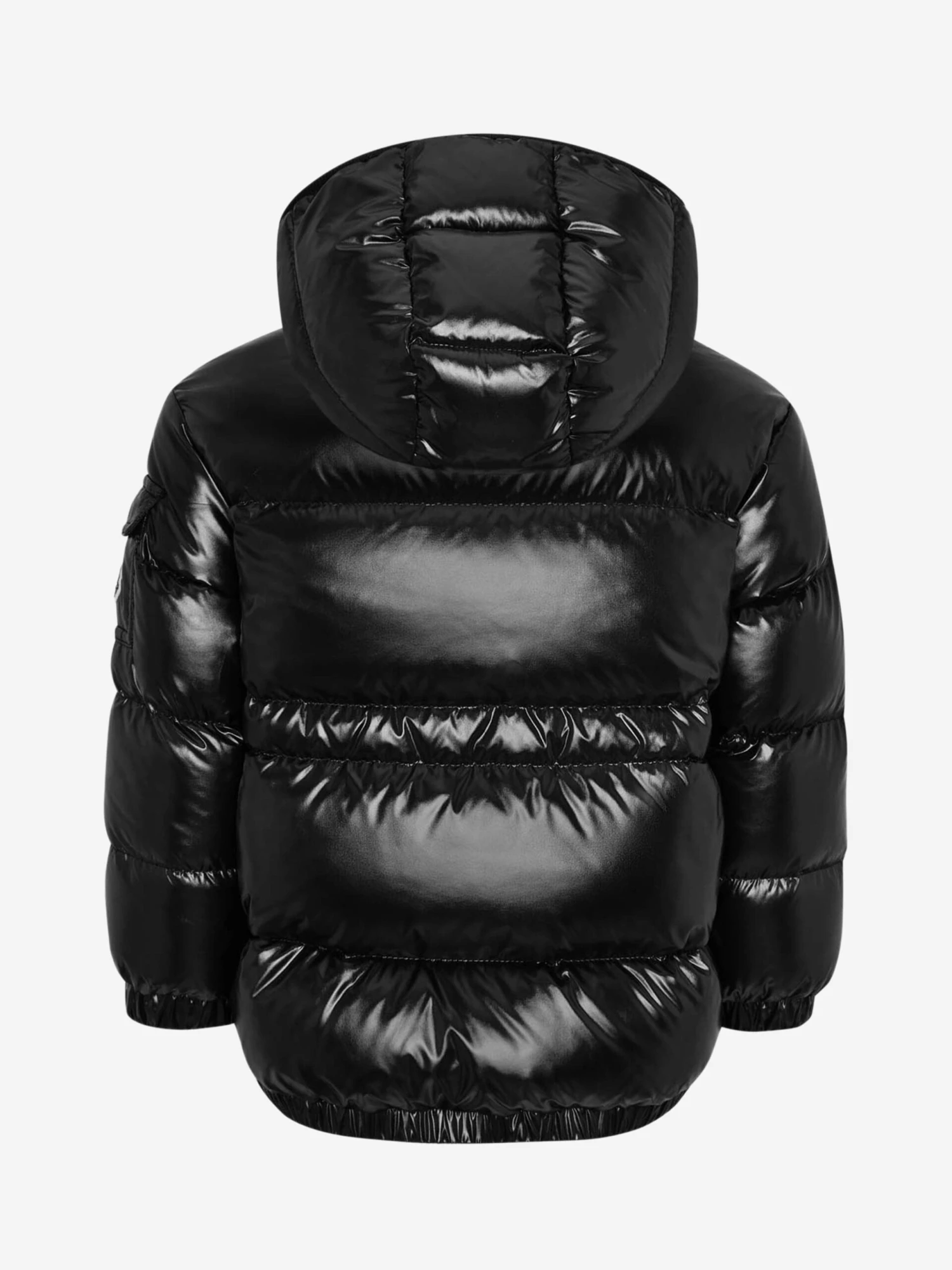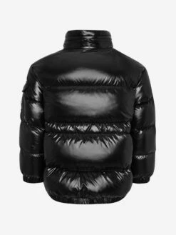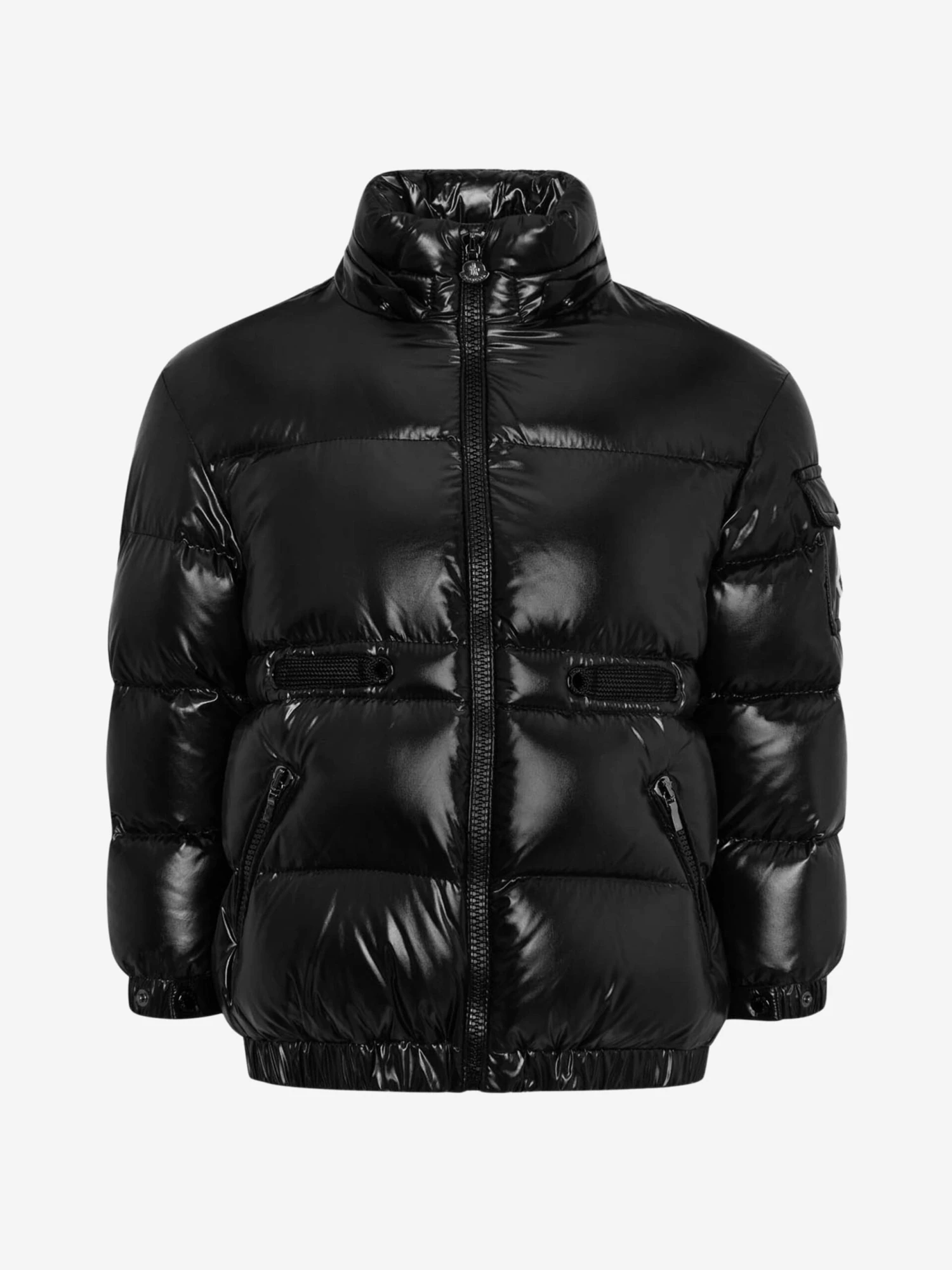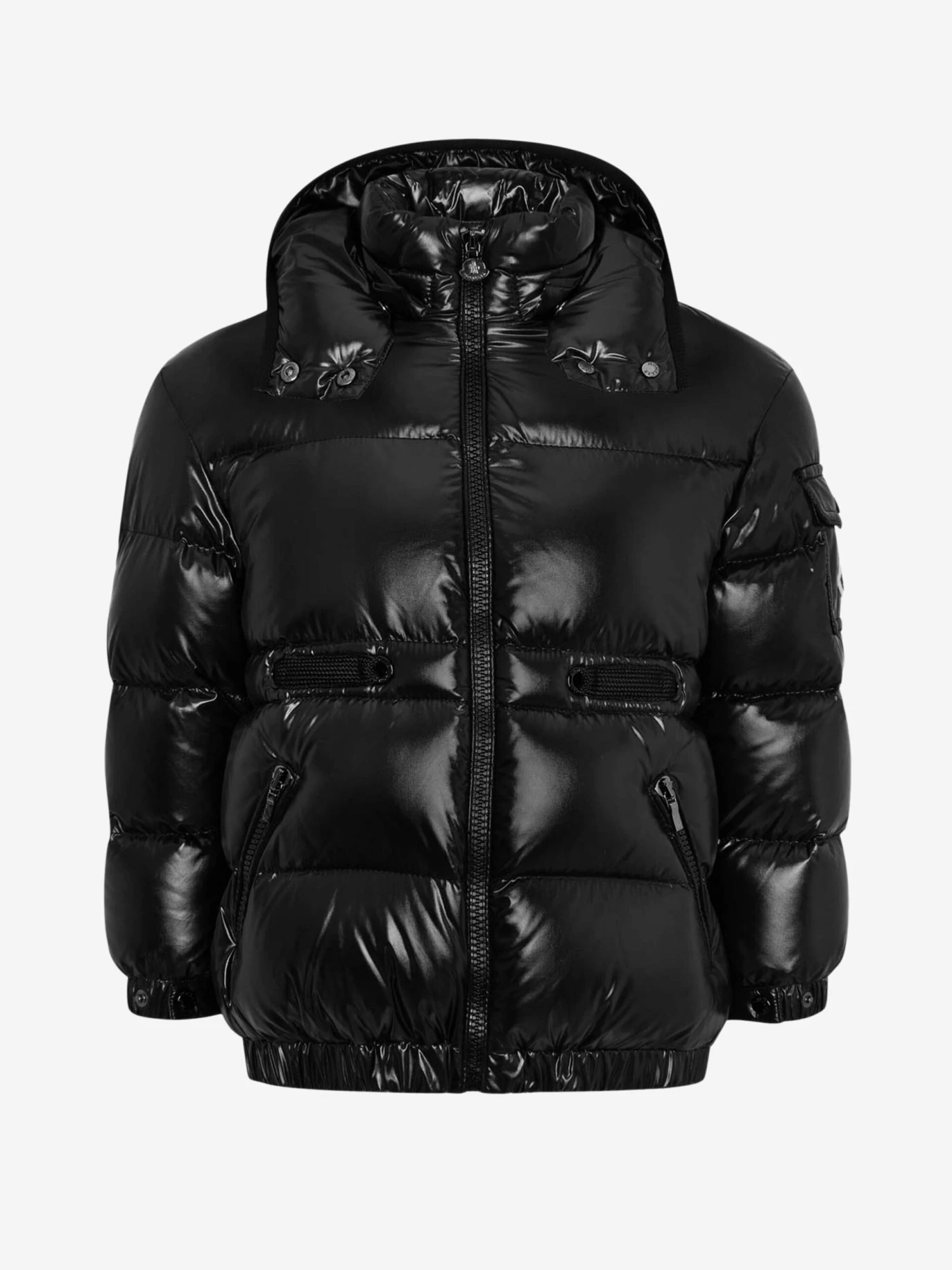 Keep out the elements with this girls black warm down padded jacket from Moncler featuring a detachable hood with wind guard, practical pockets, elasticated cuffs with snap press fastening, interior elasticated adjustable waistband and the iconic badge applique on the sleeve pocket.