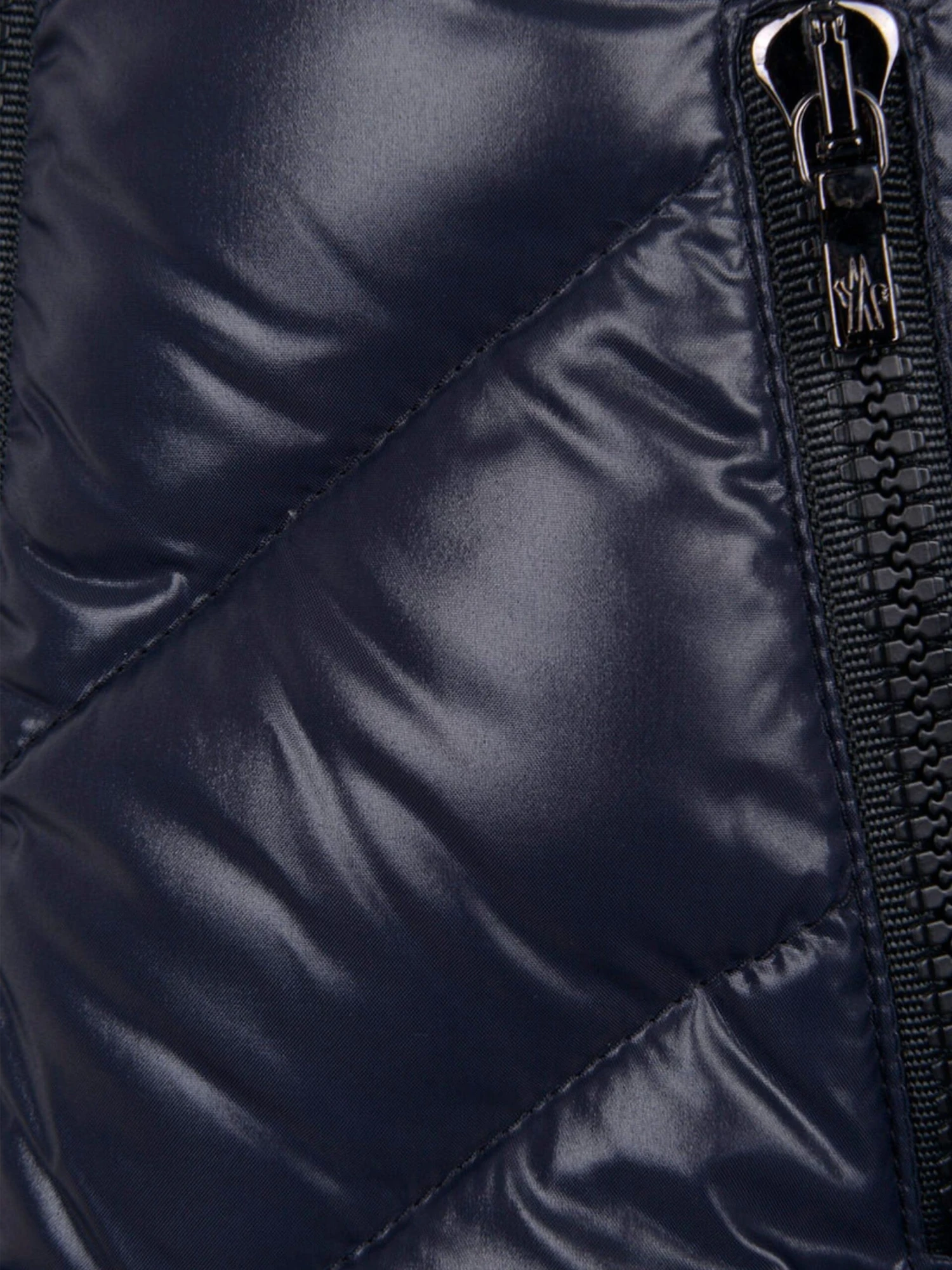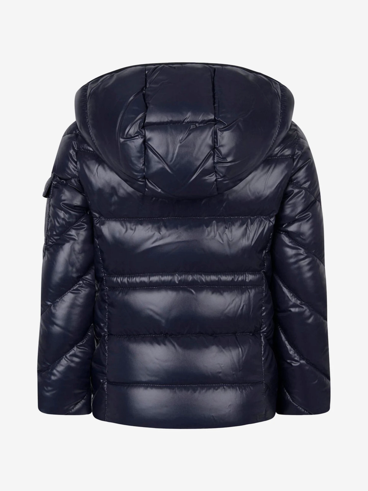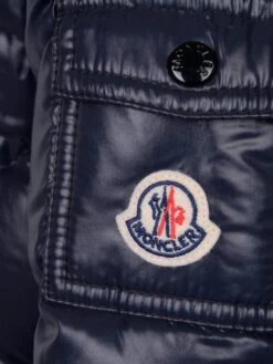 Classic ski style for in and around town, this girls navy warm down padded jacket from Moncler features contrast black highlights, a detachable hood with wind guard, practical pockets and the iconic badge applique on the sleeve pocket.