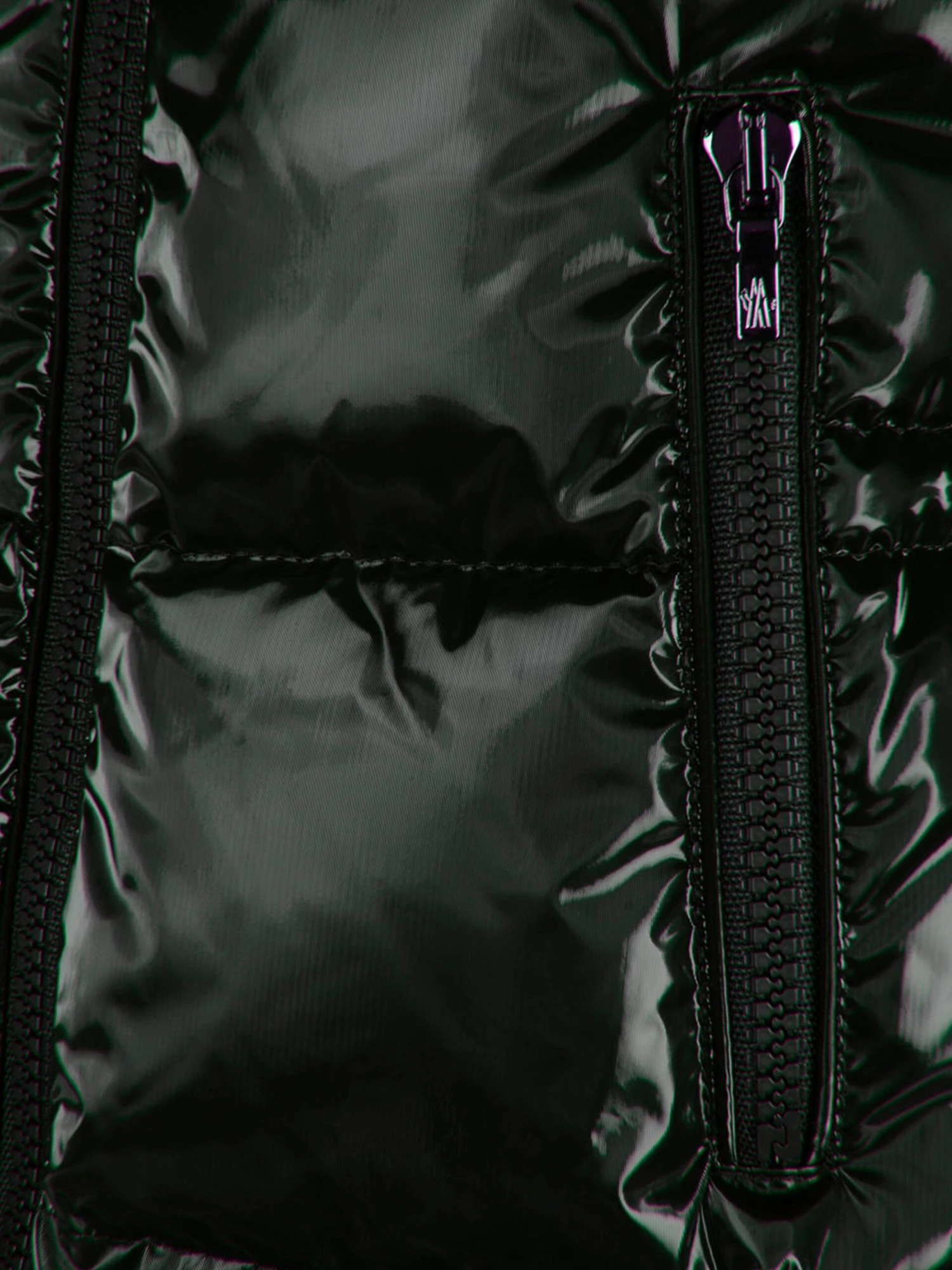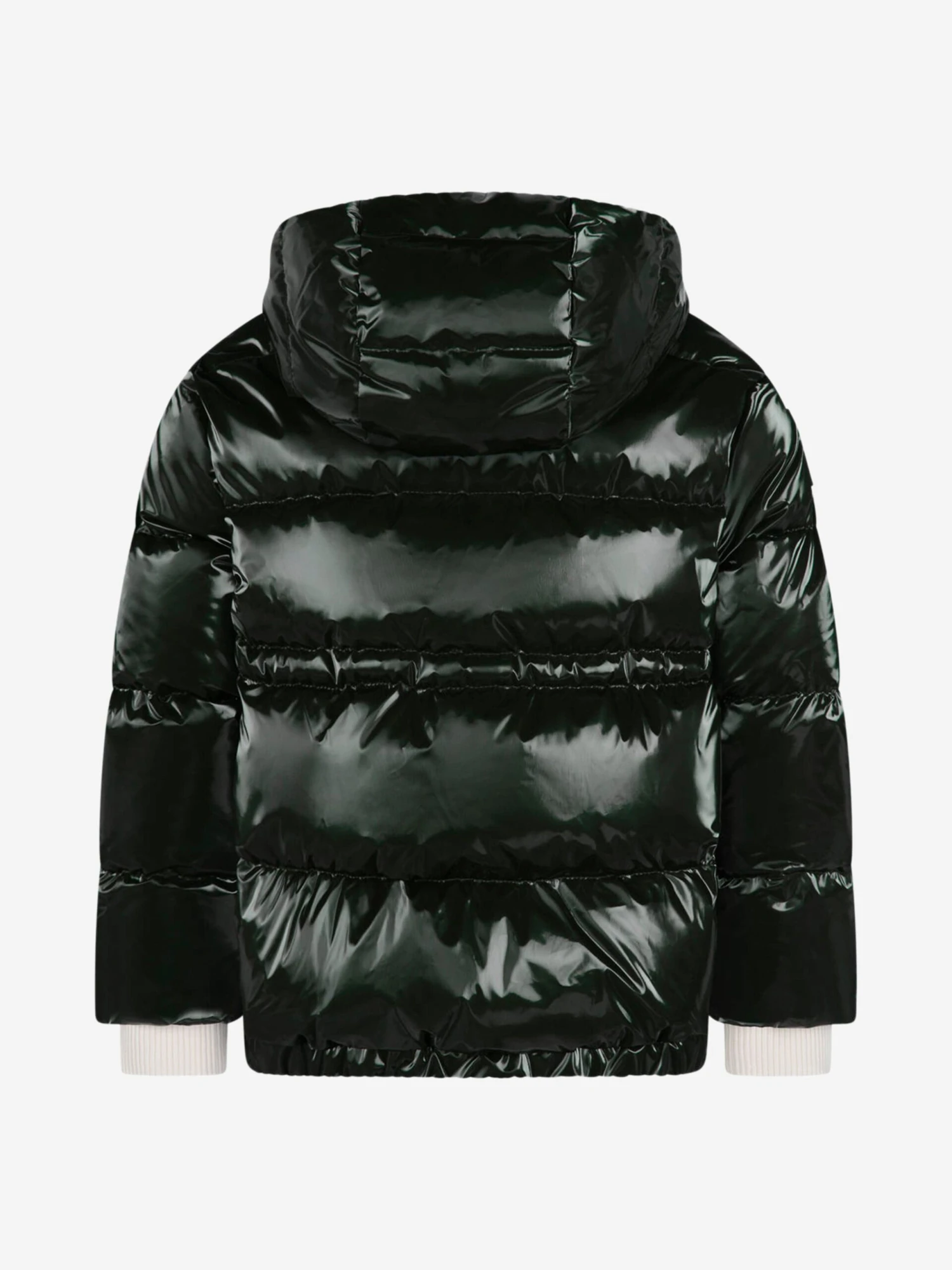 Shine bright this winter with this girls warm down padded jacket in a shiny pink finish from Moncler. Featuring a contrast white fleece hood lining, an all black logo badge on the sleeve and contrast white cuffs.
