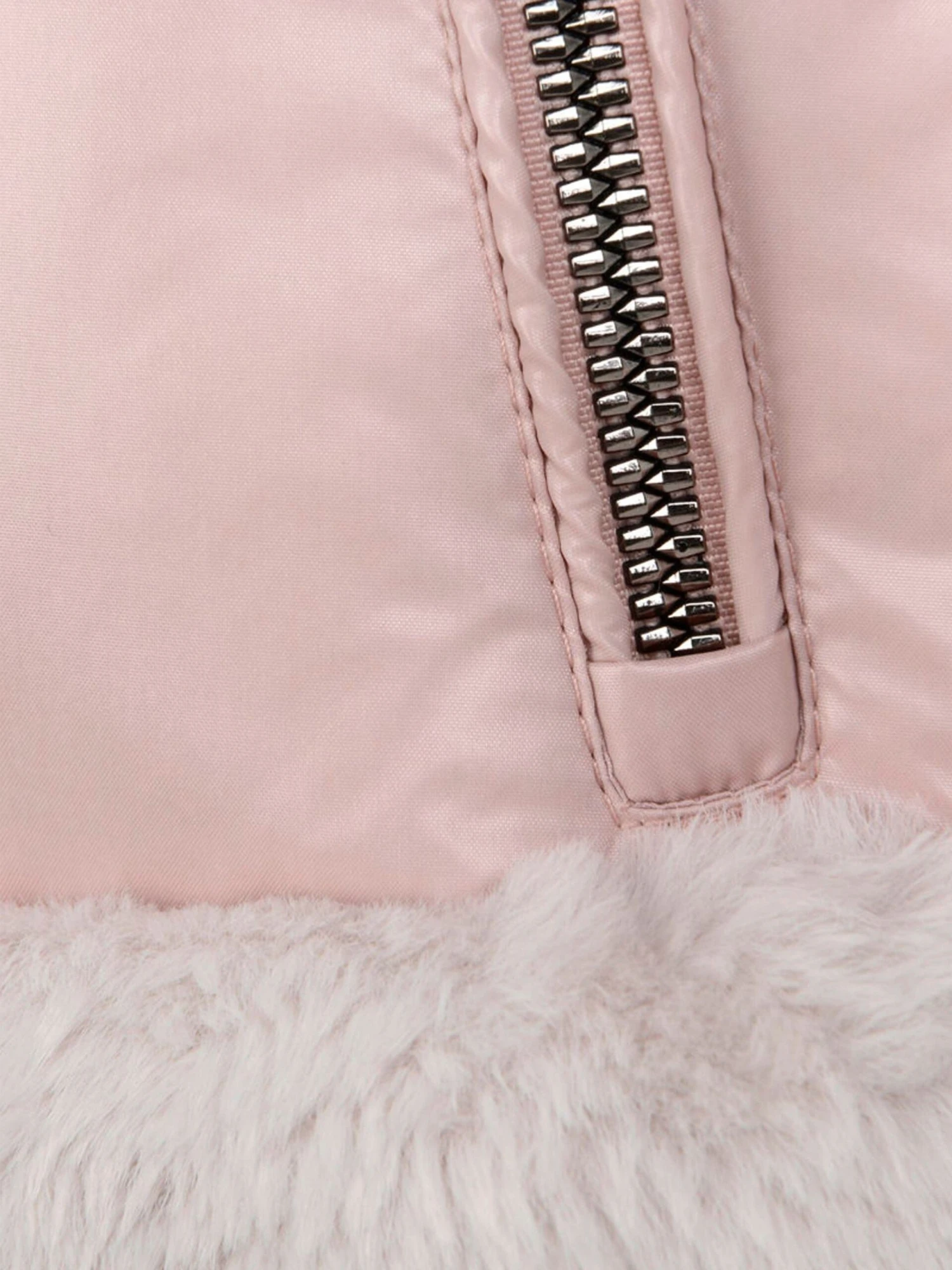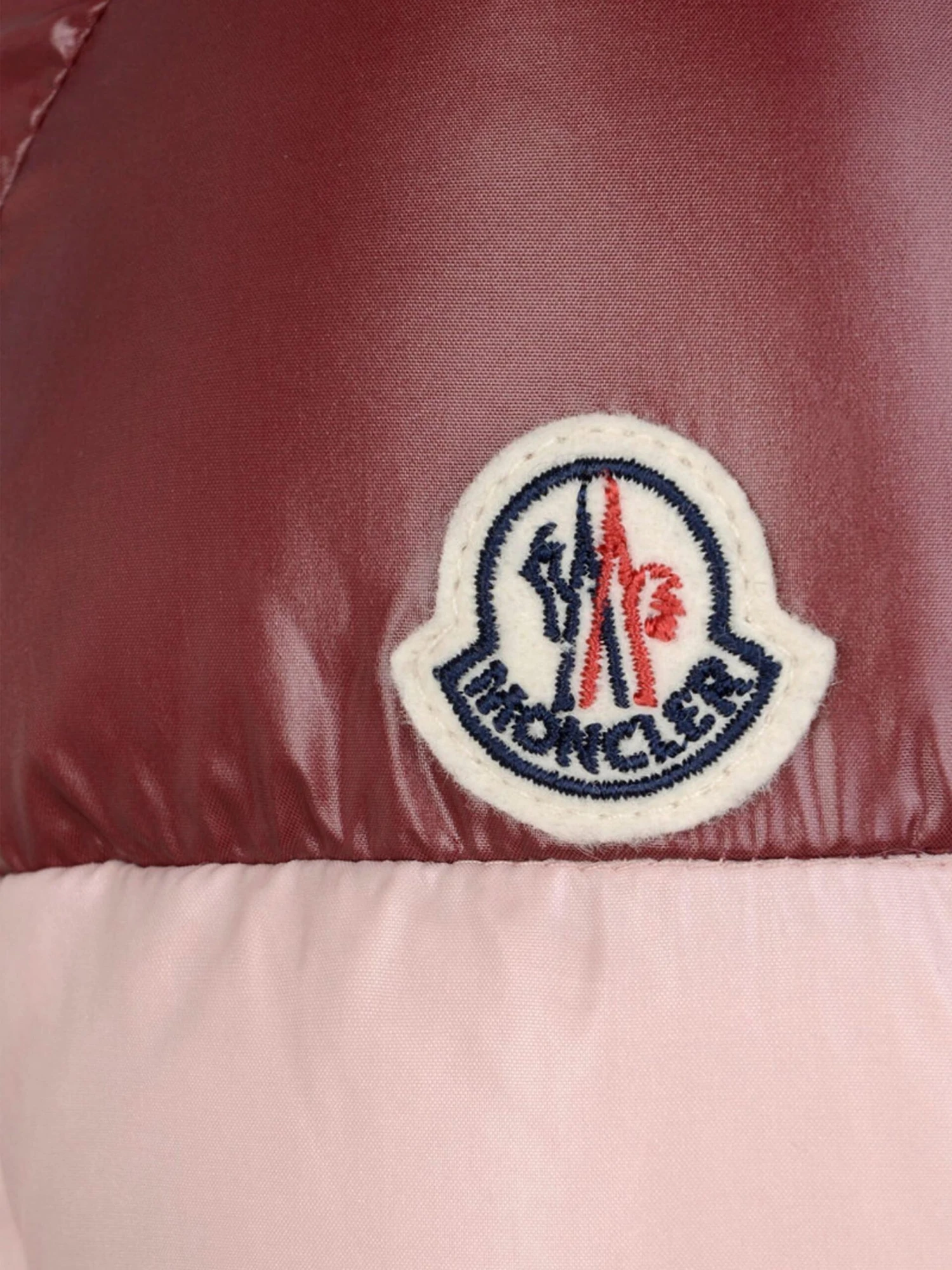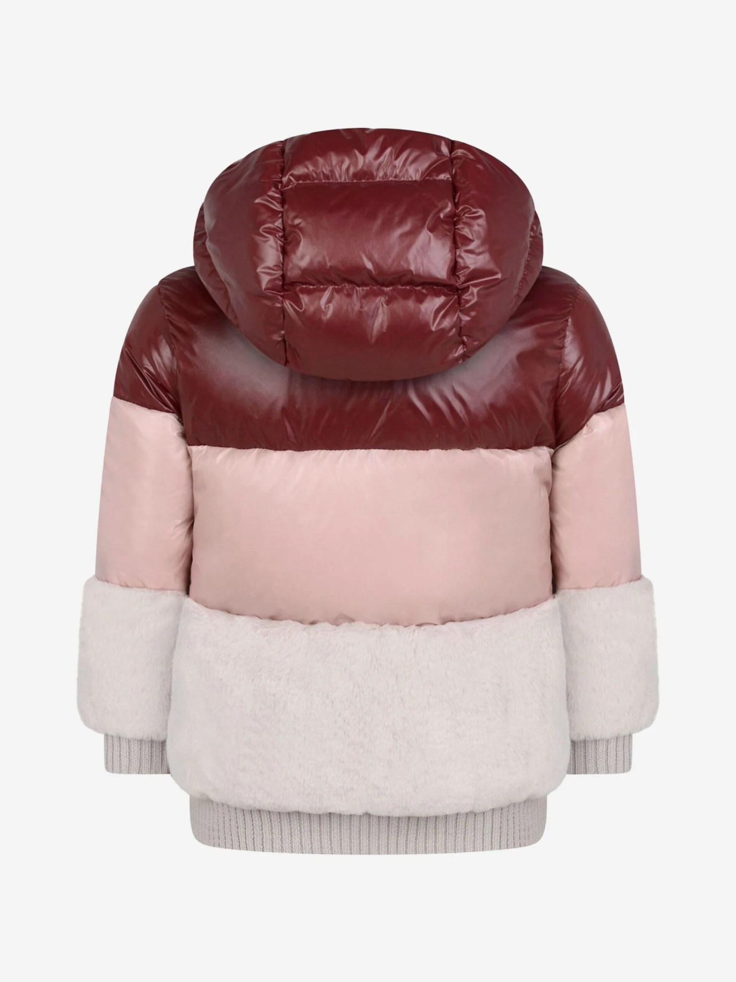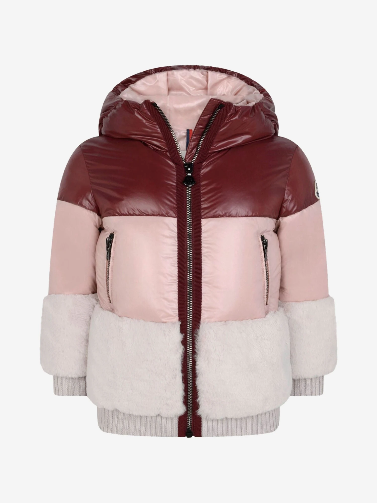 Alpine style meets animal instincts with this girls black down padded jacket from Moncler featuring fur panelling on the sleeves and above the hem, burgundy panelling on the chest and hood, ribbed trims, an embossed zip and the iconic badge applique on the sleeve.
