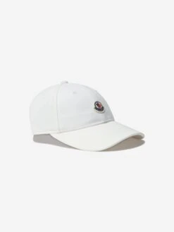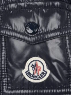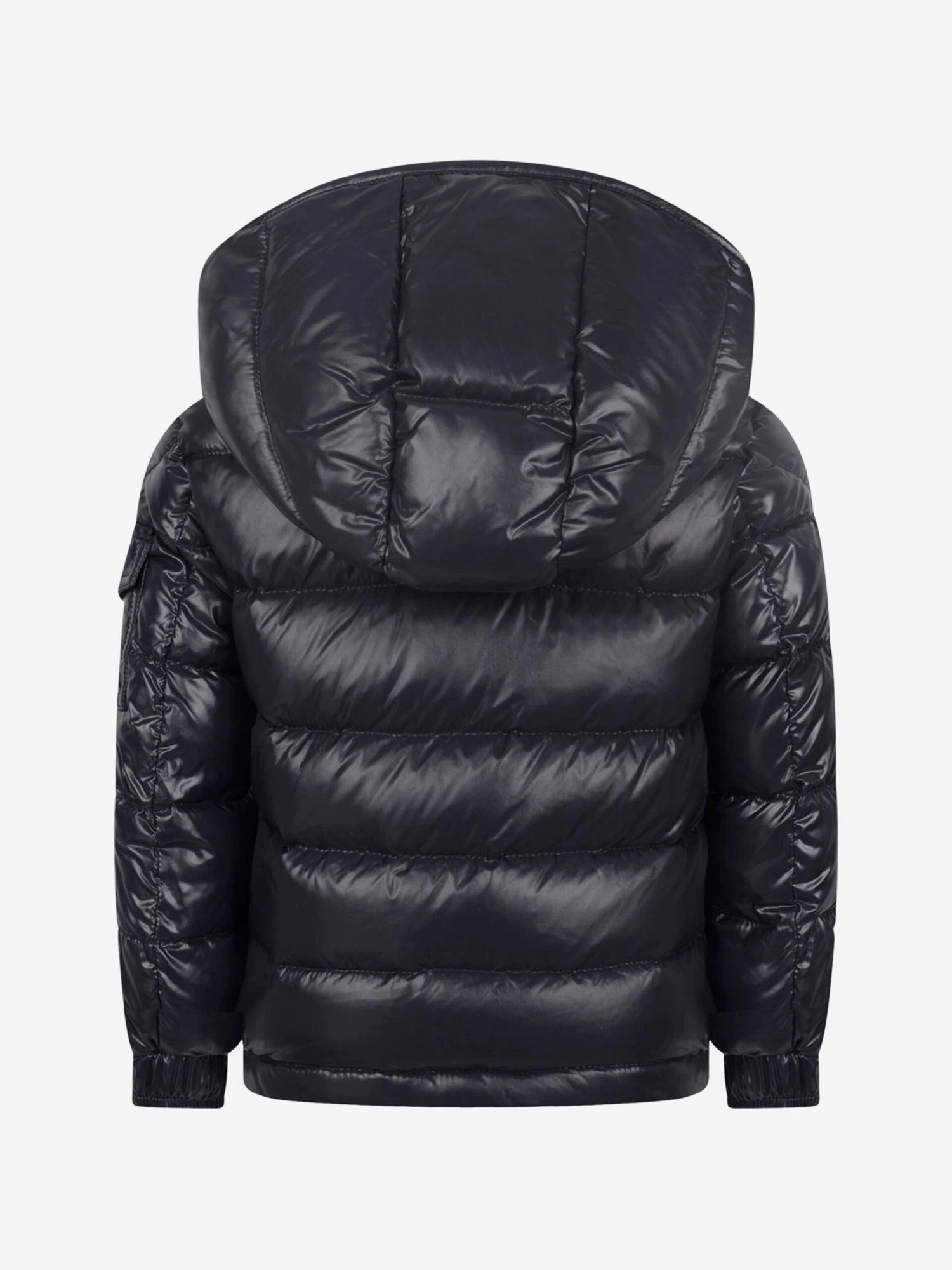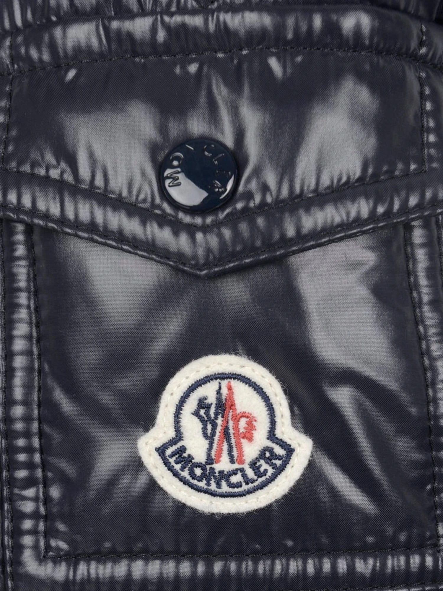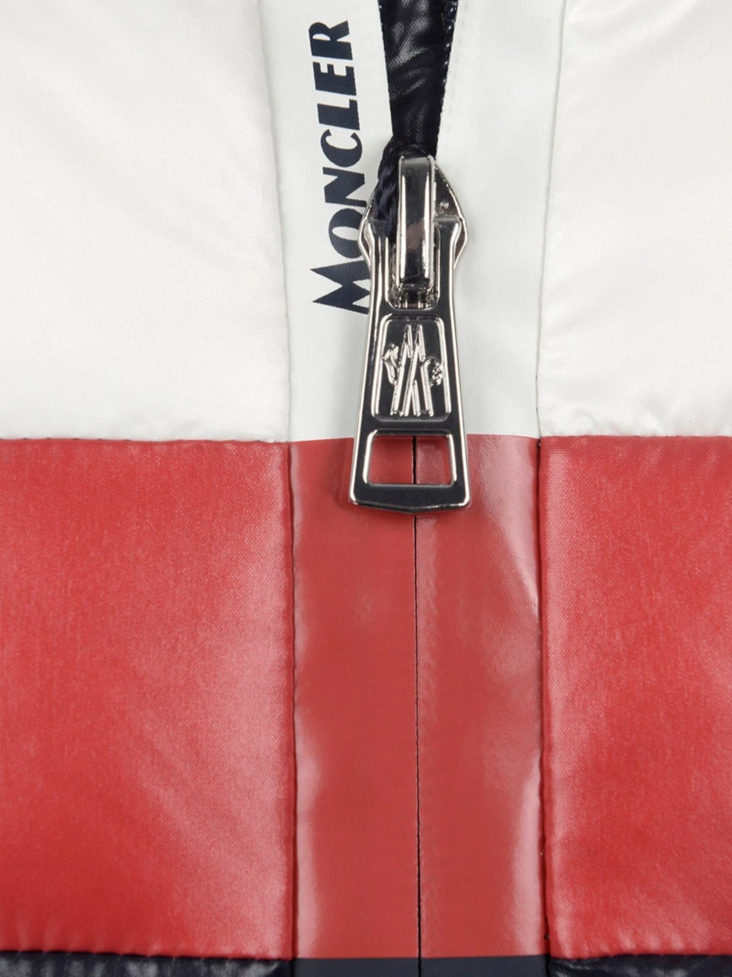 Boys navy down padded jacket from Moncler featuring a tricolour colour block across the chest and a badge applique on the sleeve pocket.