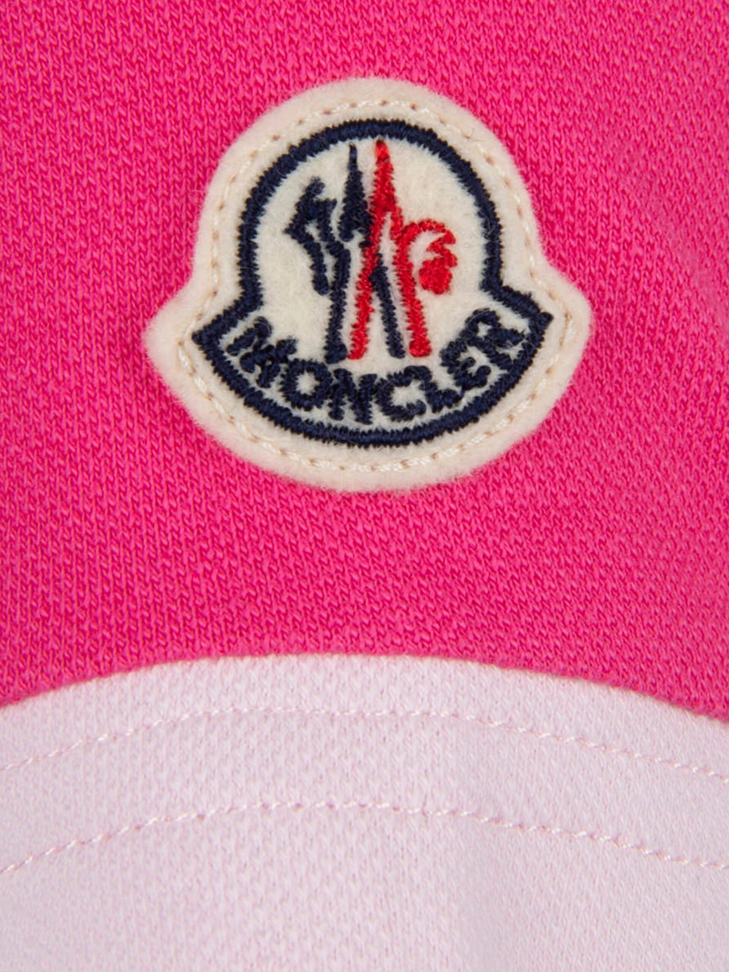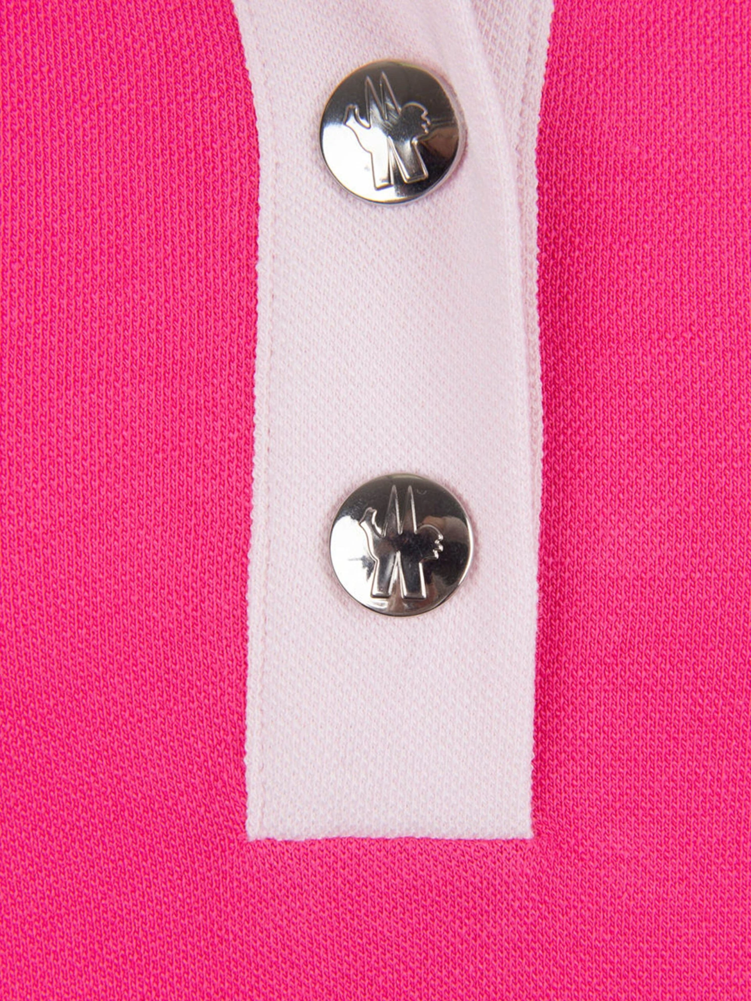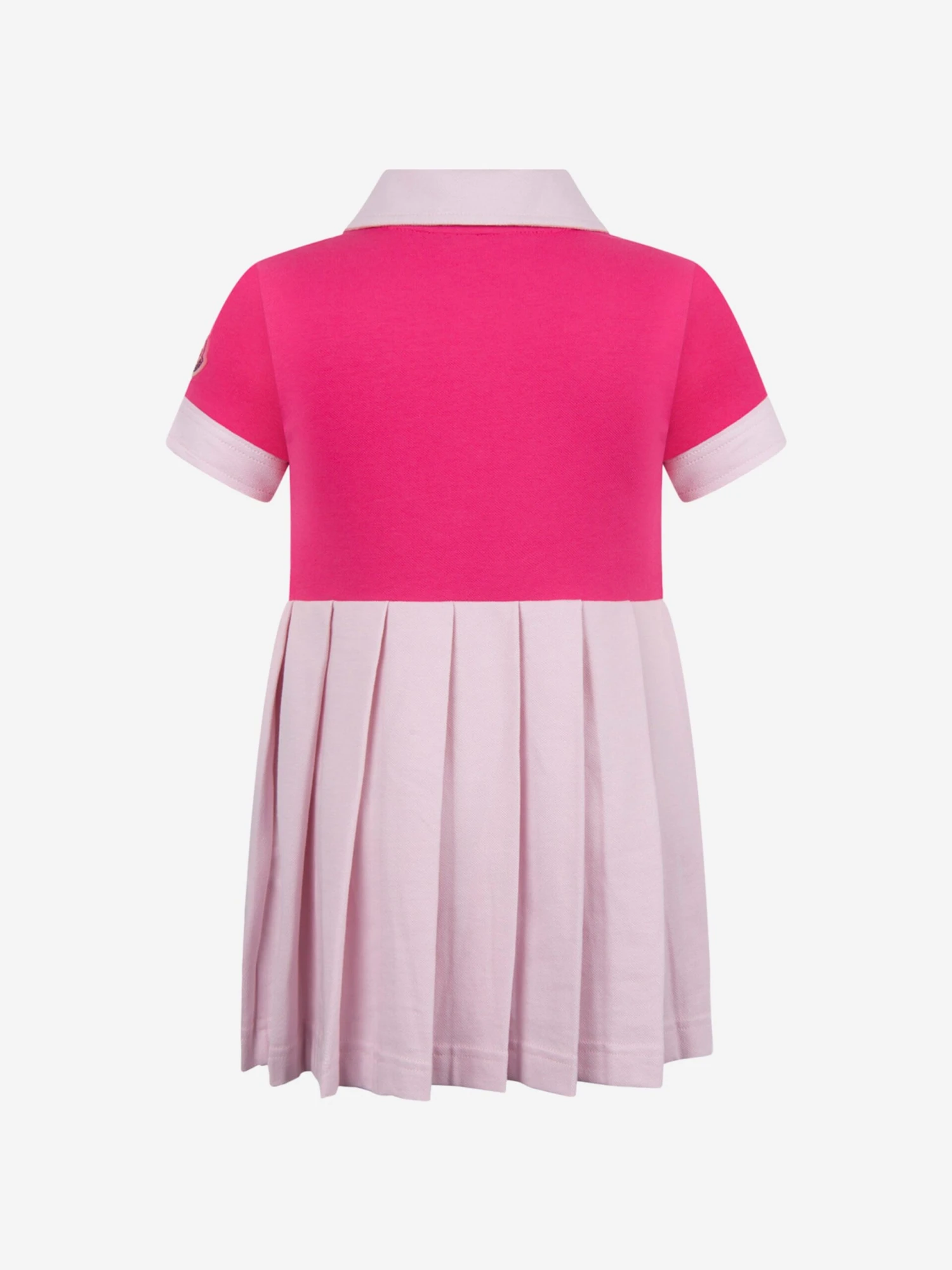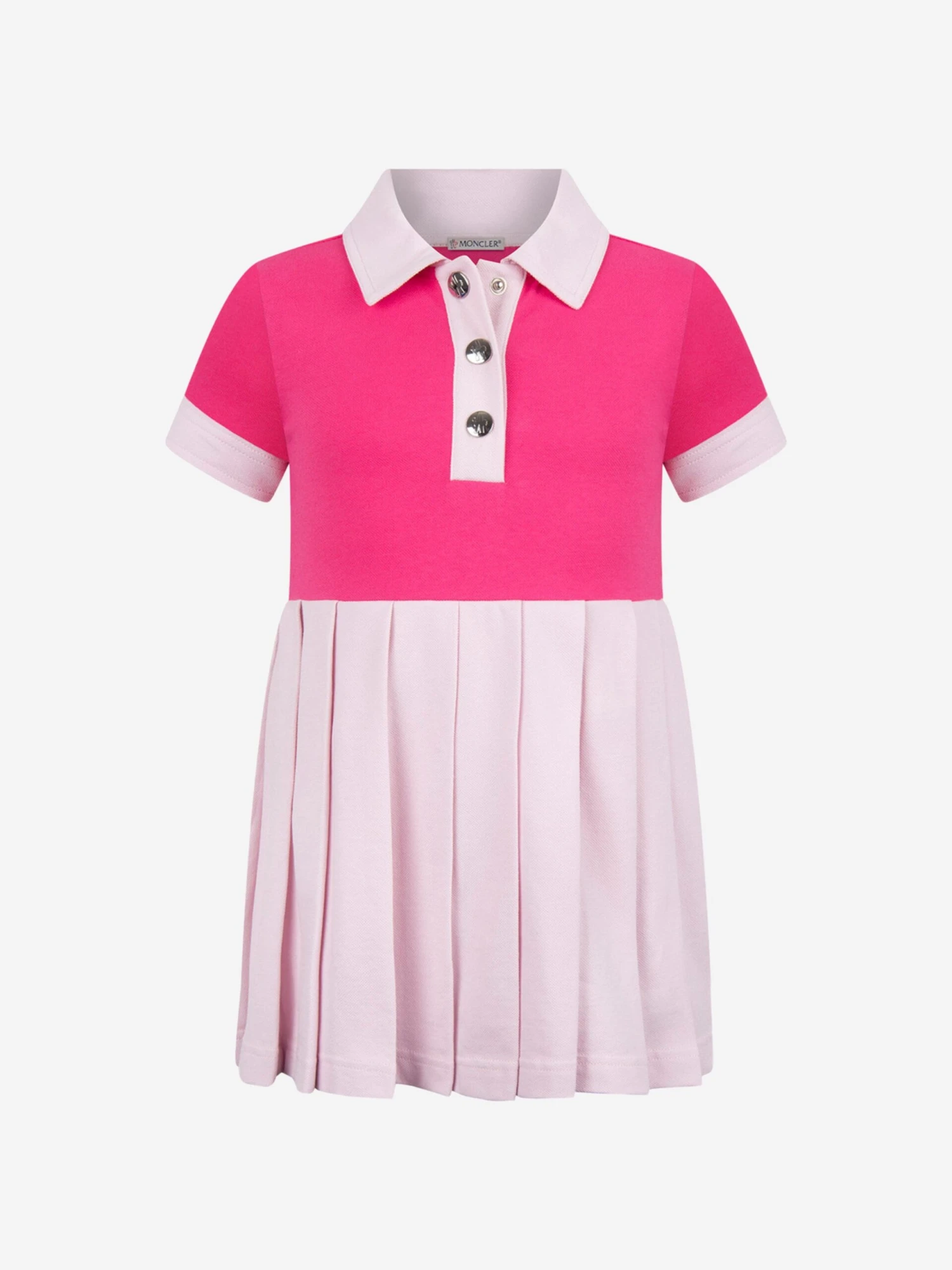 Girls pink piqué polo dress from Moncler. Features a rib-knit collar and cuffs, embossed metallic snap-press placket, the iconic badge appliqué on the sleeve and pleated skirt.