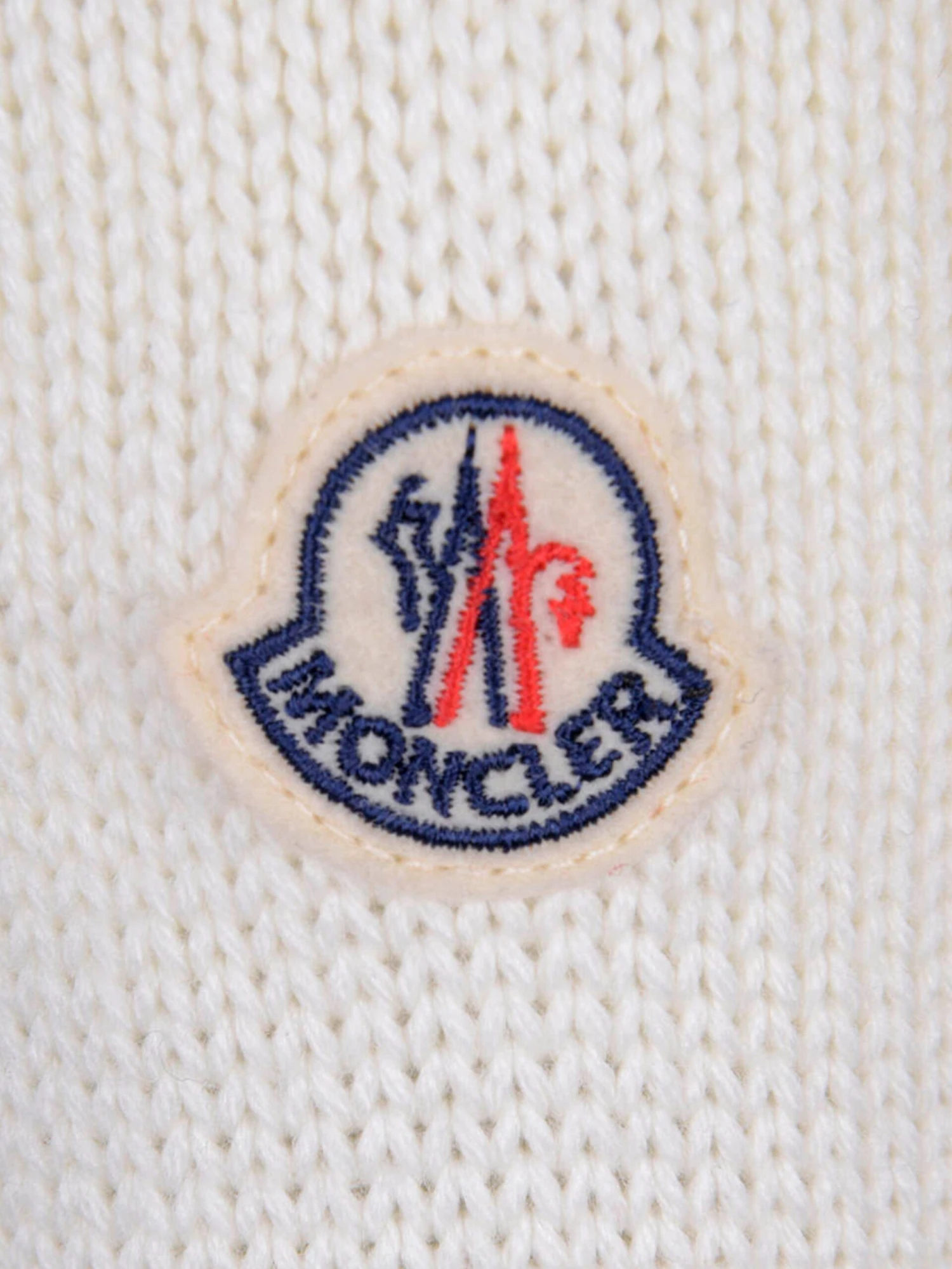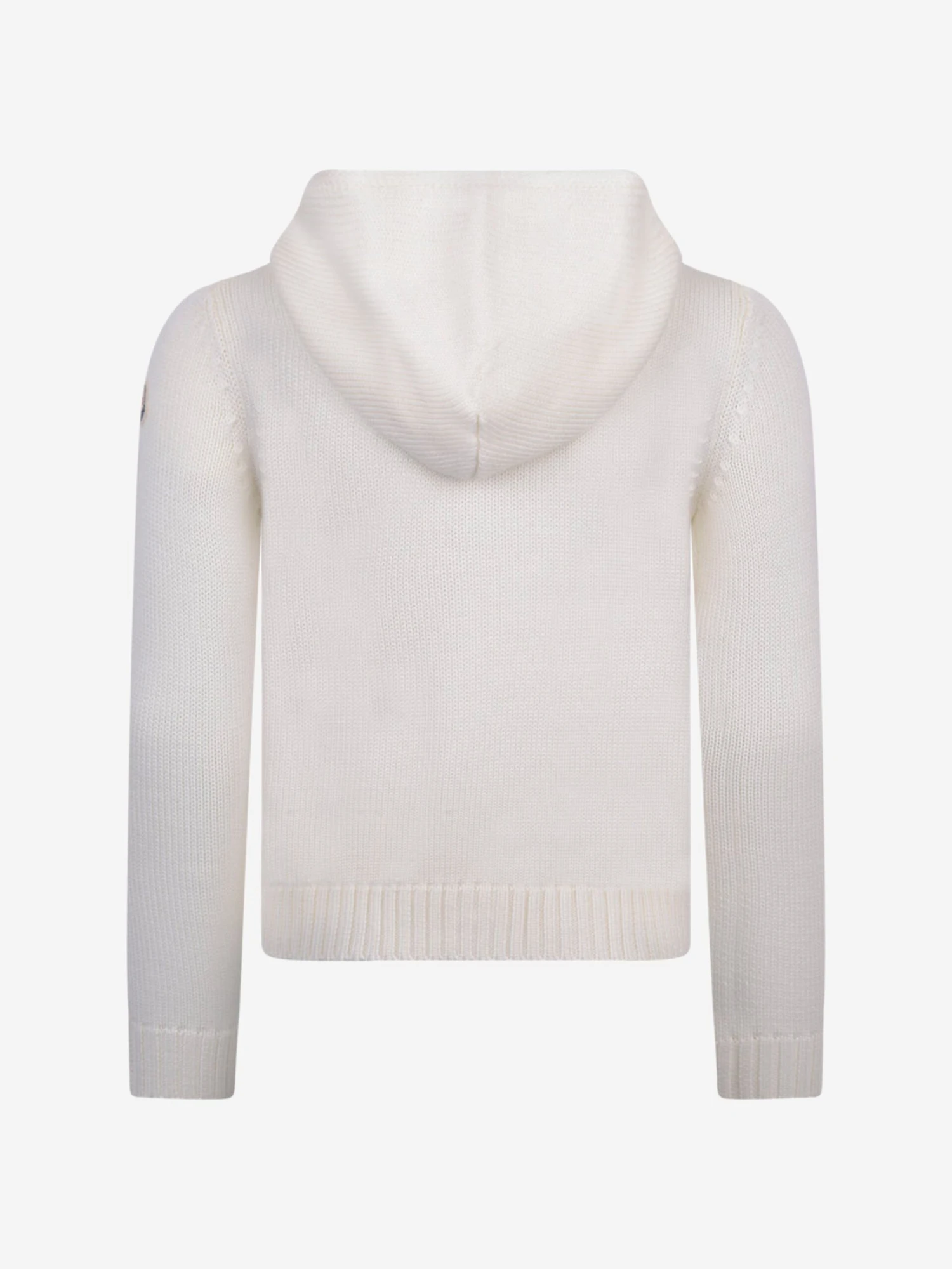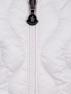 Warm and wonderful this girls white down padded wool cardigan from Moncler features ribbed trims, quilted body, embossed zip pull and the iconic badge applique on the sleeve.