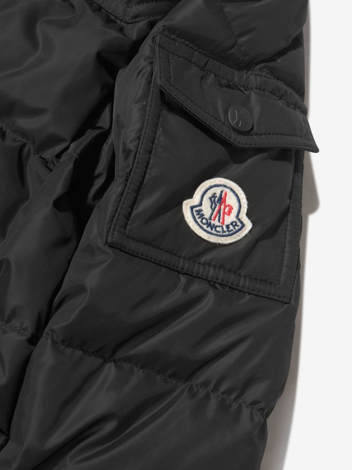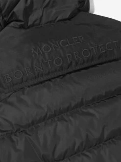 Mini-me, black hooded puffer coat for boys and girls by Moncler Enfant. Made from recycled, high-performance nylon, it has a smooth matt outer and a shiny lining, with soft down padding for superior comfort and warmth. The coat fastens with a zip and branded poppers and has popper-fastening pockets on the front. There is a further patch pocket on one sleeve, together with the brand’s iconic logo badge.