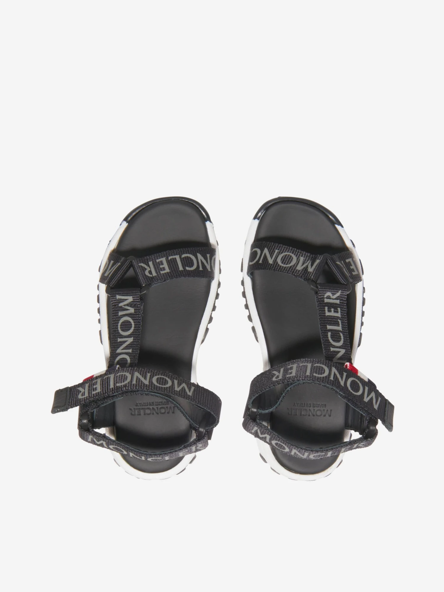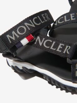 Luxury black hiking style sandals for boys and girls by Moncler Enfant. They have sturdy canvas straps with gray logo lettering and the brand’s iconic tricolor tabs on the adjustable velcro fastening ankle straps. The soft leather insole is molded for comfort and they have black and white deep tread outer soles for a good grip.