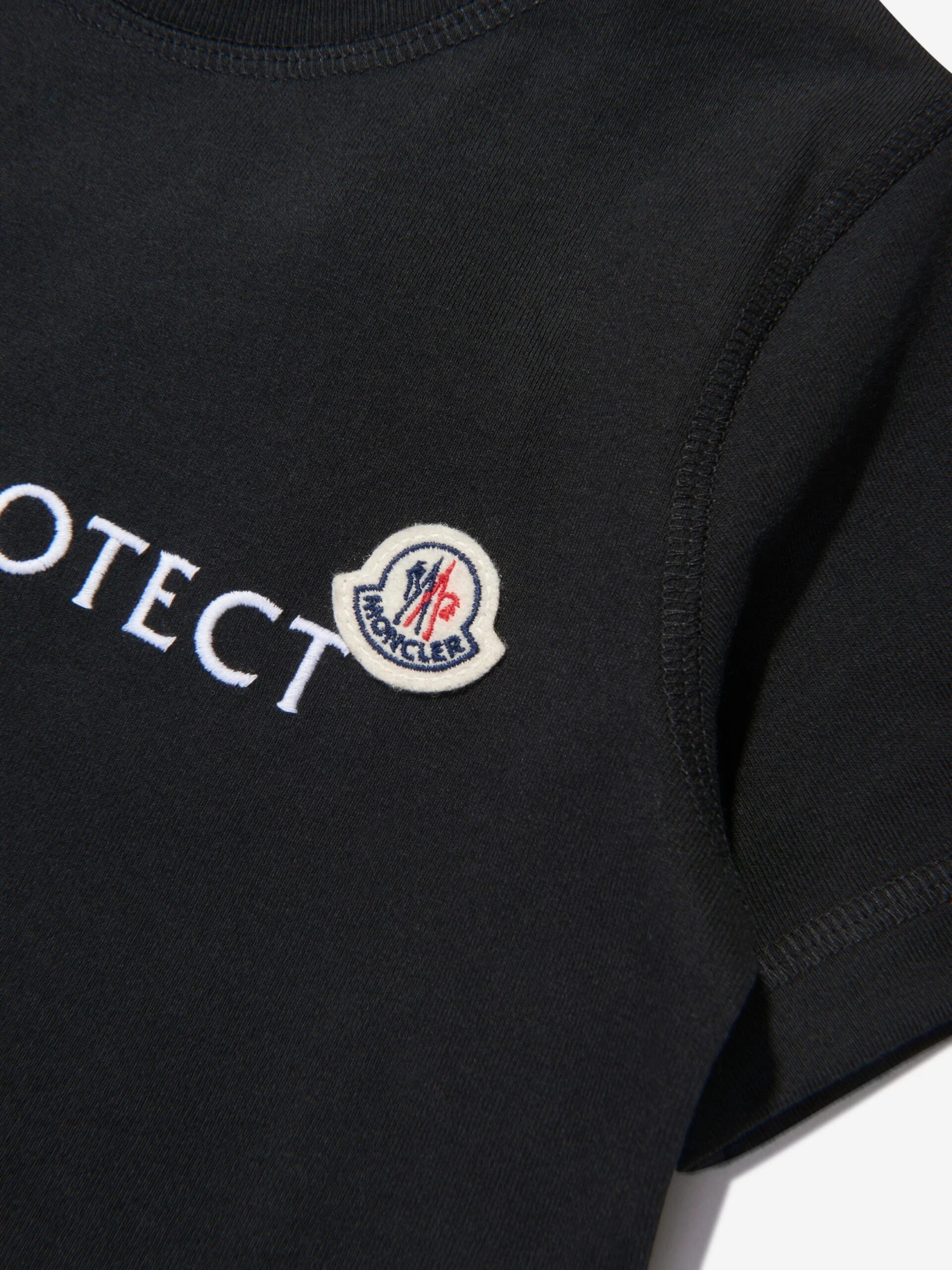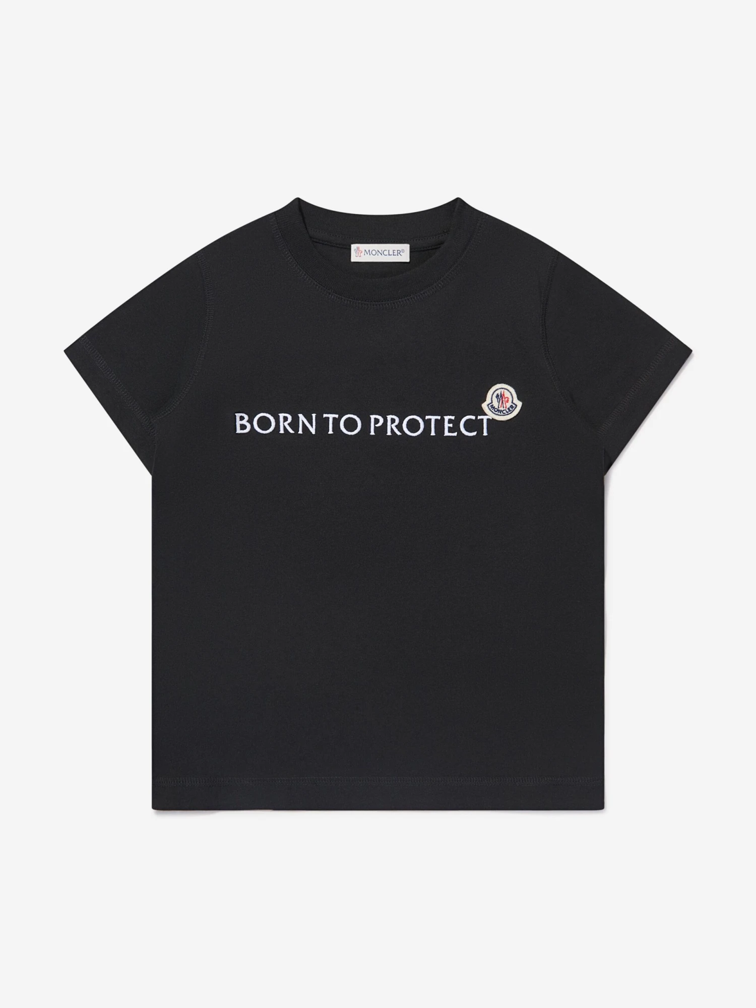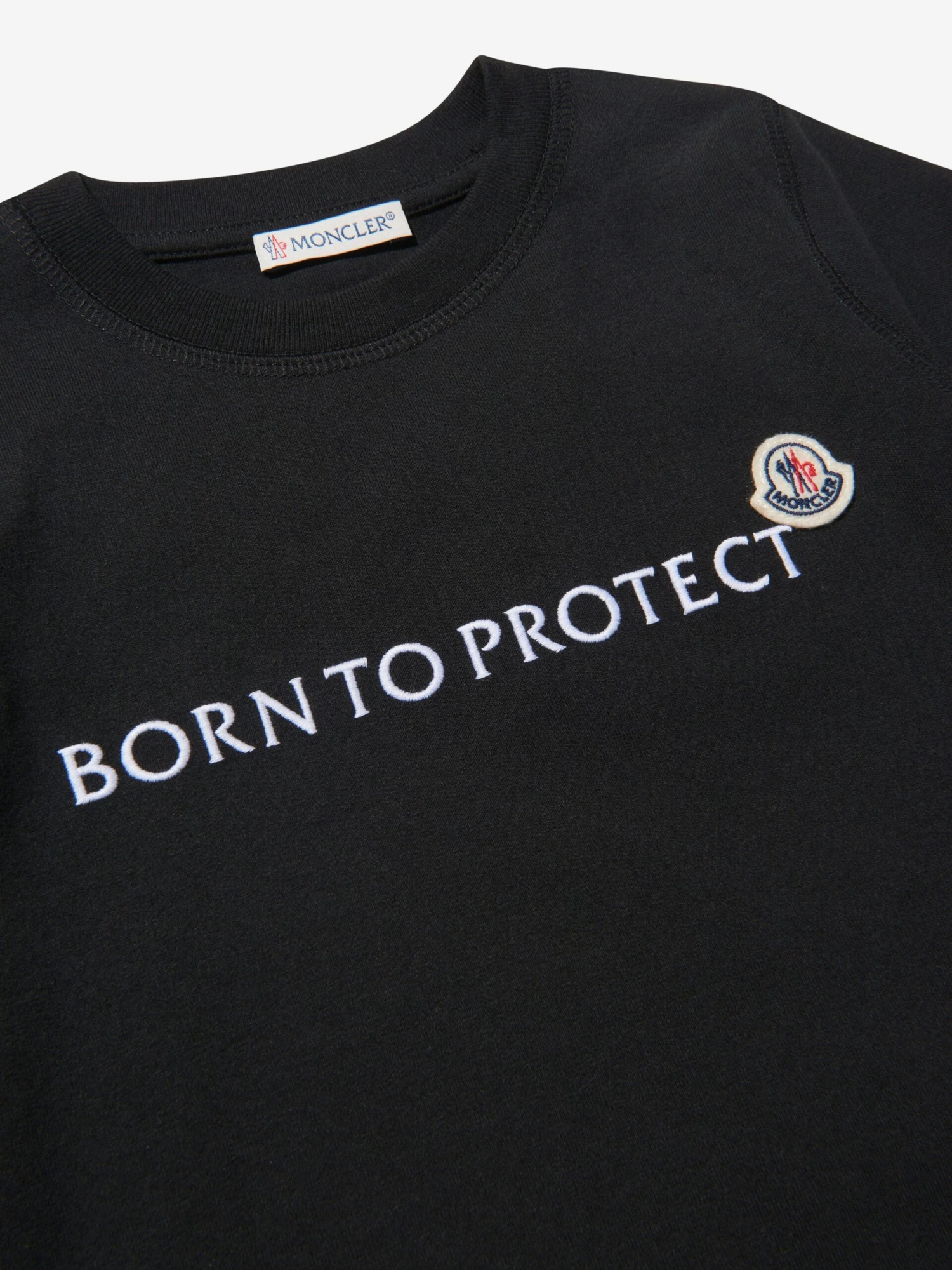 Elevate their wardrobe with this Moncler unisex t-shirt in black. The soft fabric boasts the signature Moncler logo with embroidered Born to Protect lettering across the front. Pair with a jumper and trousers for an easy everyday outfit.